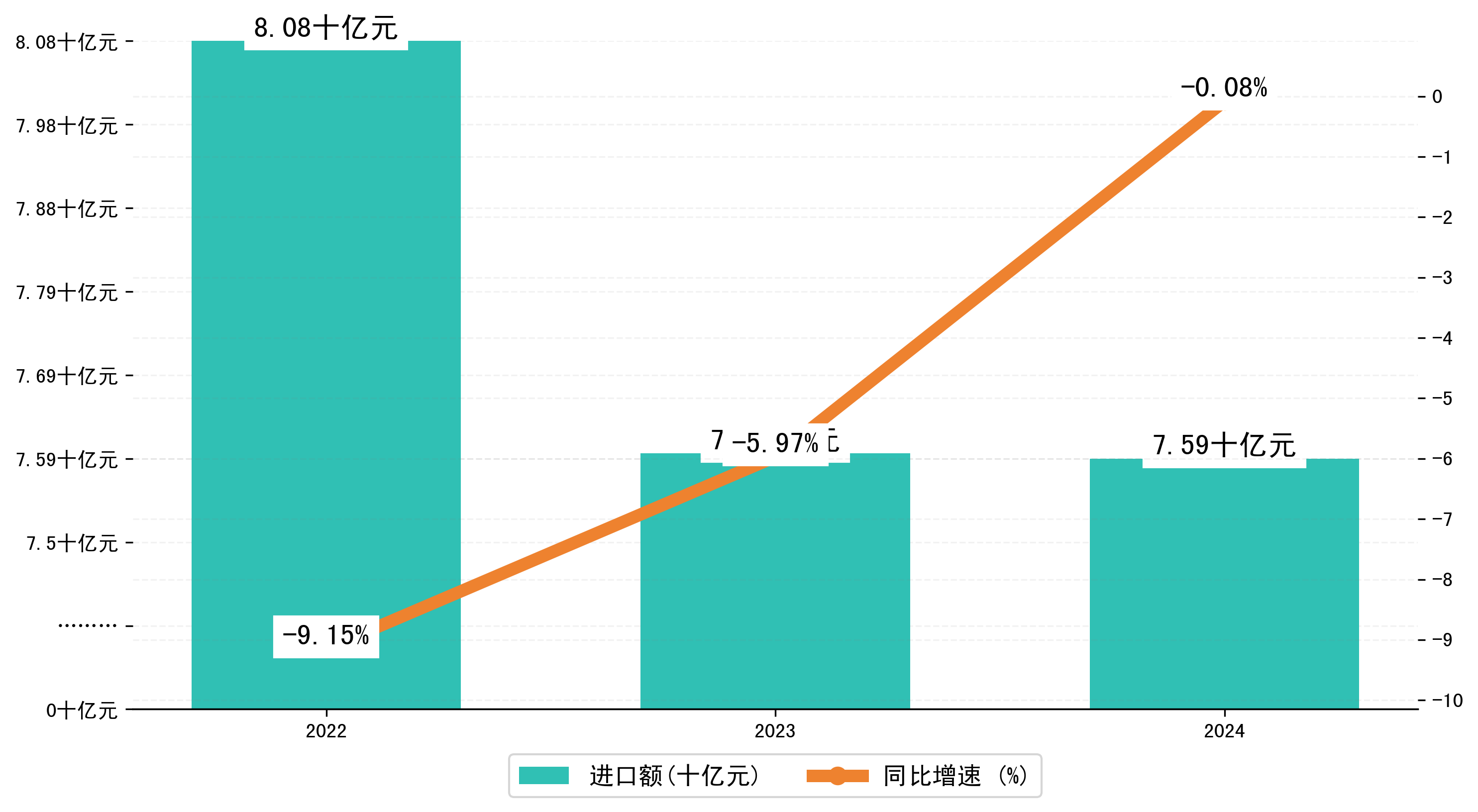 以人民币计,2024年1-8月绥芬河市进口额为75,9436.9439万元,相比上年同期减少了595.2778万元,同比减少了-0.50%。