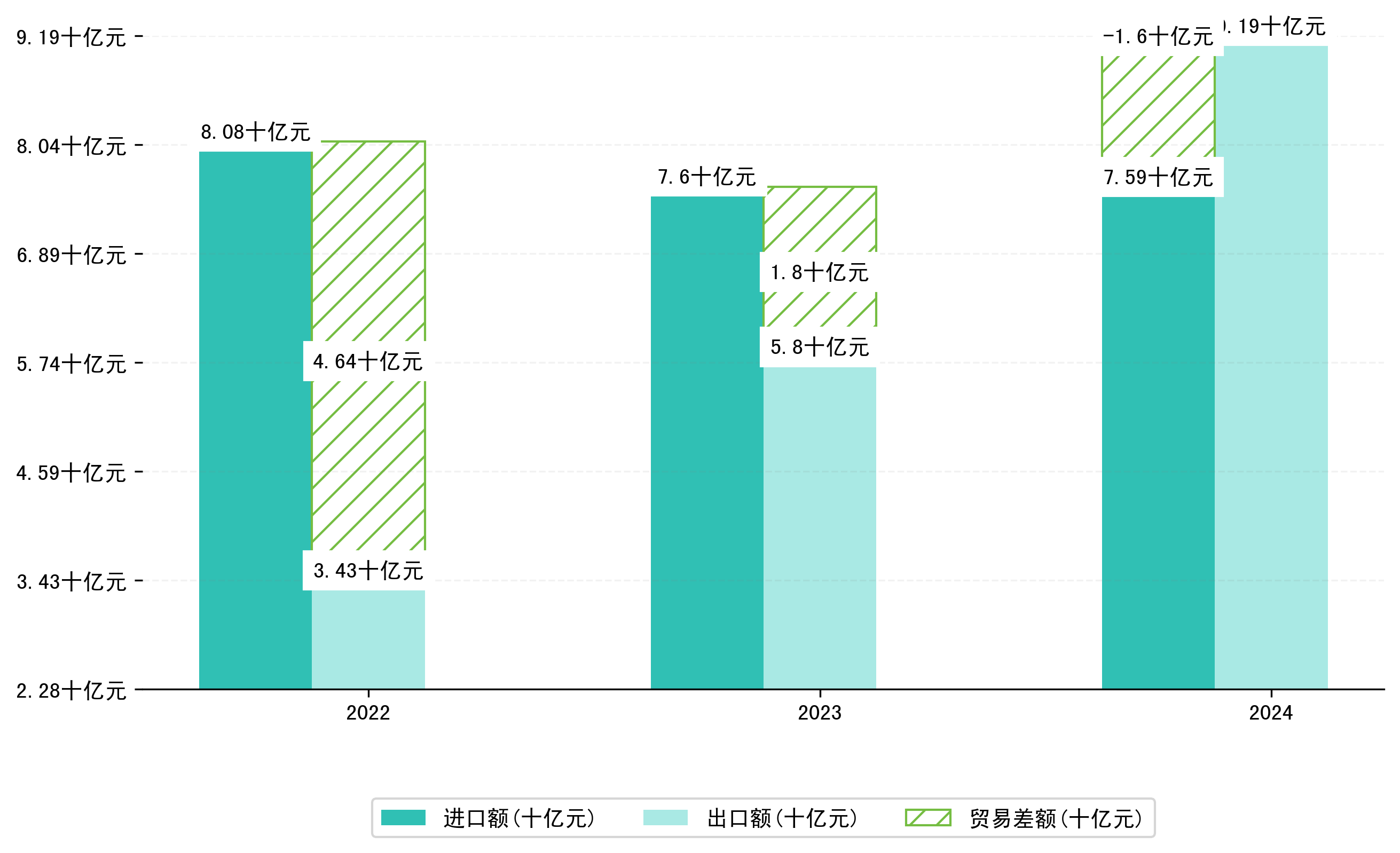 以人民币计,2024年8月绥芬河市贸易差额为5,1588,2618万元(贸易顺差),相比上月减少了4,6093,9550万元,即6528,0017万美元;相比上年同期增加了2,5644,3716万元,同比增加98.85%。