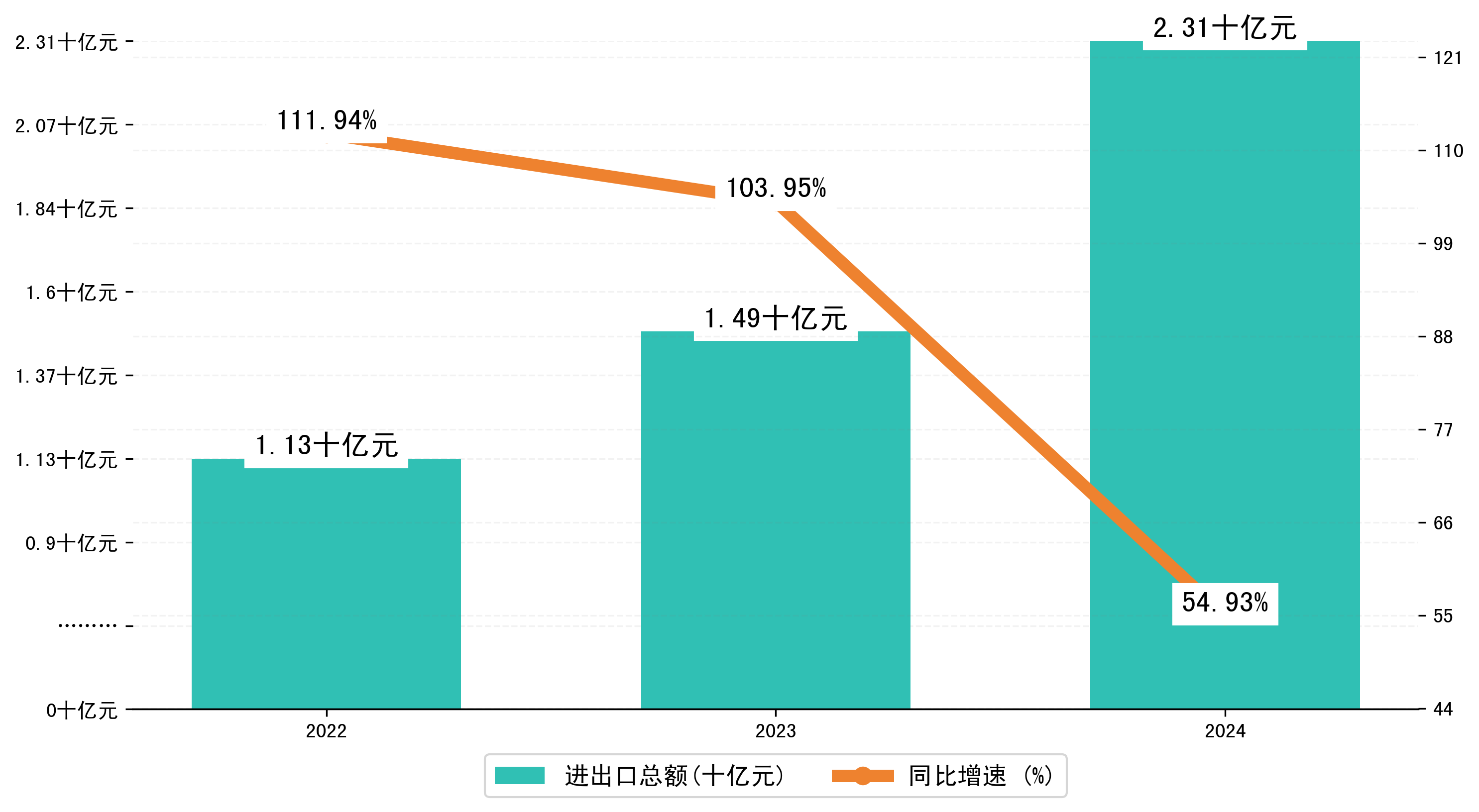 以美元计,2024年1-1月绥芬河市进出口总额为3,2549.3062万美元,相比上年同期增加了1,1293.5252万美元,同比增加52.80%。