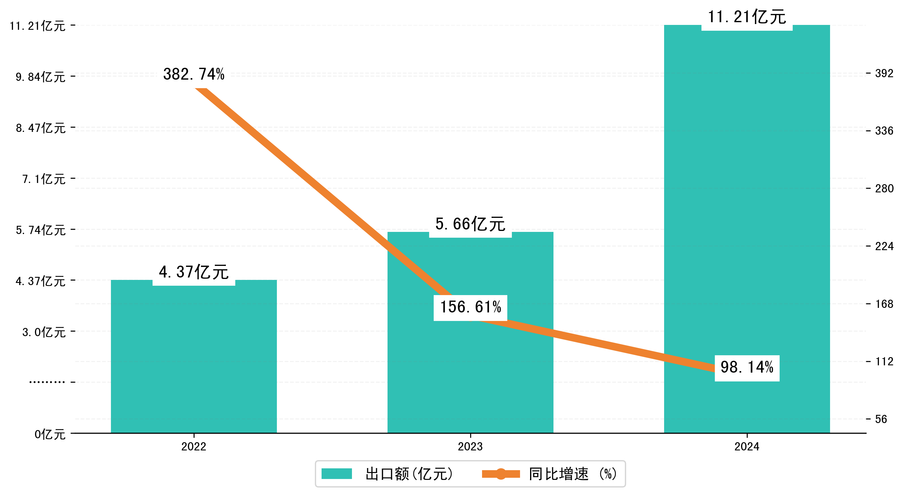 以人民币计,2024年1-1月绥芬河市出口额为11,2088.2715万元,相比上年同期增加了5,5519.1463万元,同比增加了98.50%。