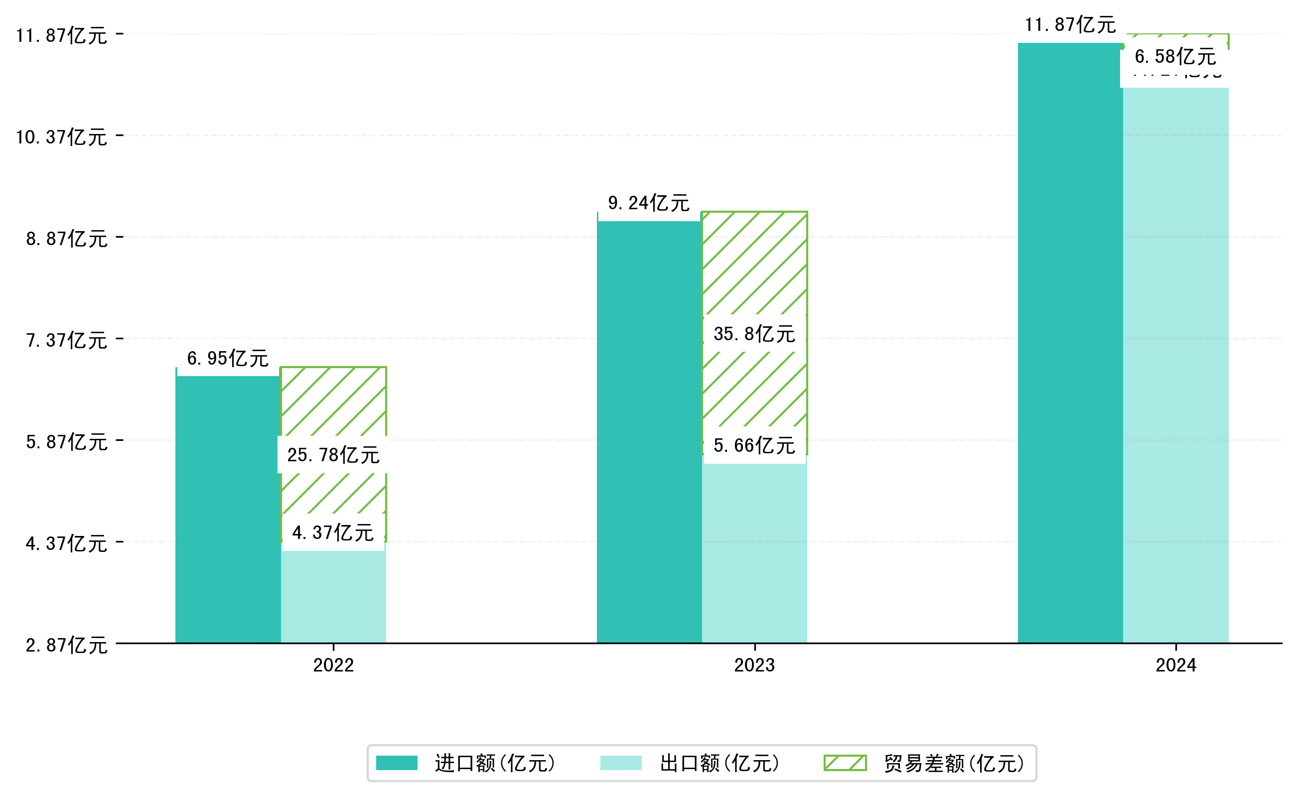 以人民币计,2024年1-1月绥芬河市贸易差额为6578,8300万元(贸易逆差),相比上年同期增加了2,9219,8304万元,同比增加-81.62%。