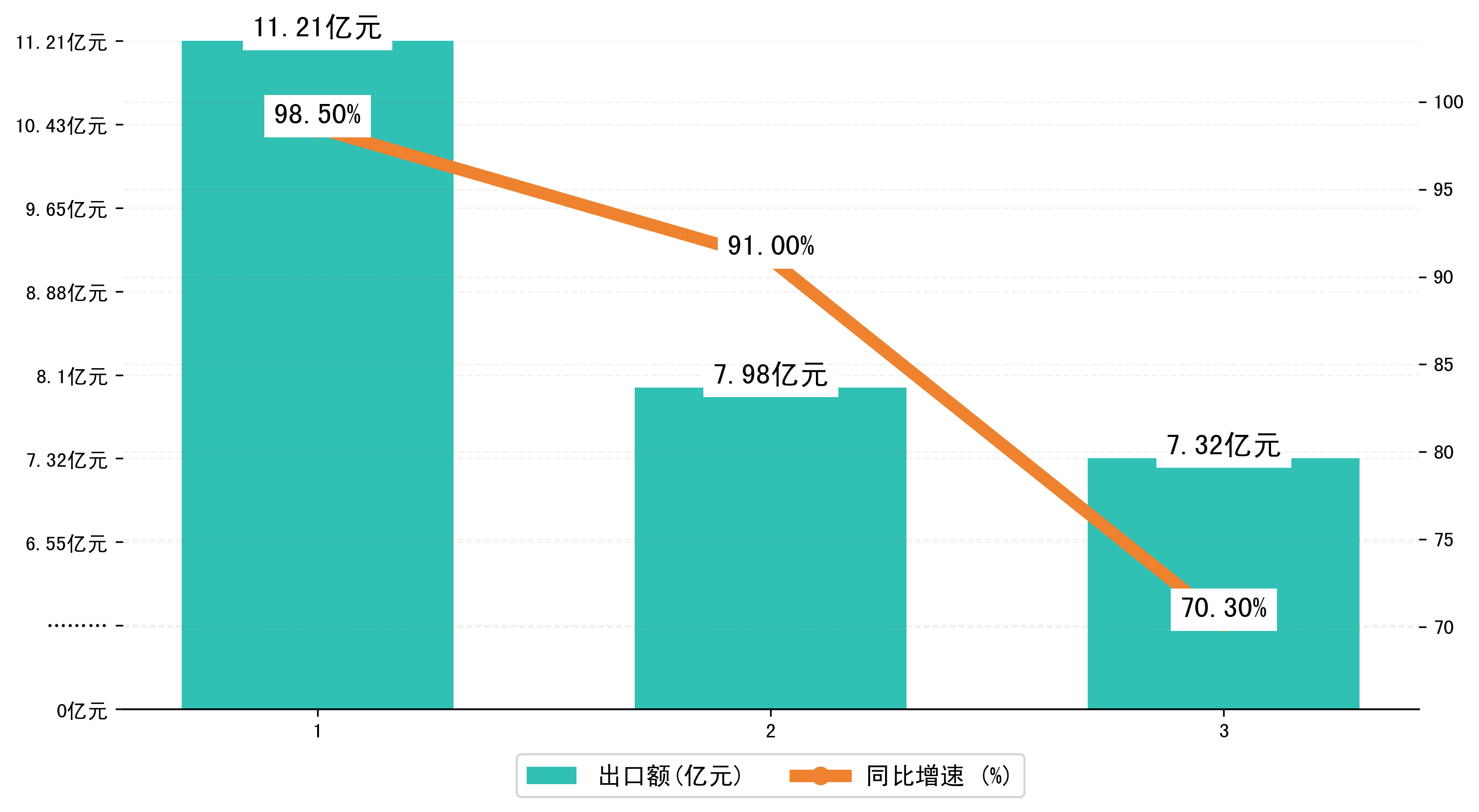 以人民币计,2024年1-3月绥芬河市出口额为26,5163.0237万元,相比上年同期增加了10,9427.0842万元,同比增加了70.30%。