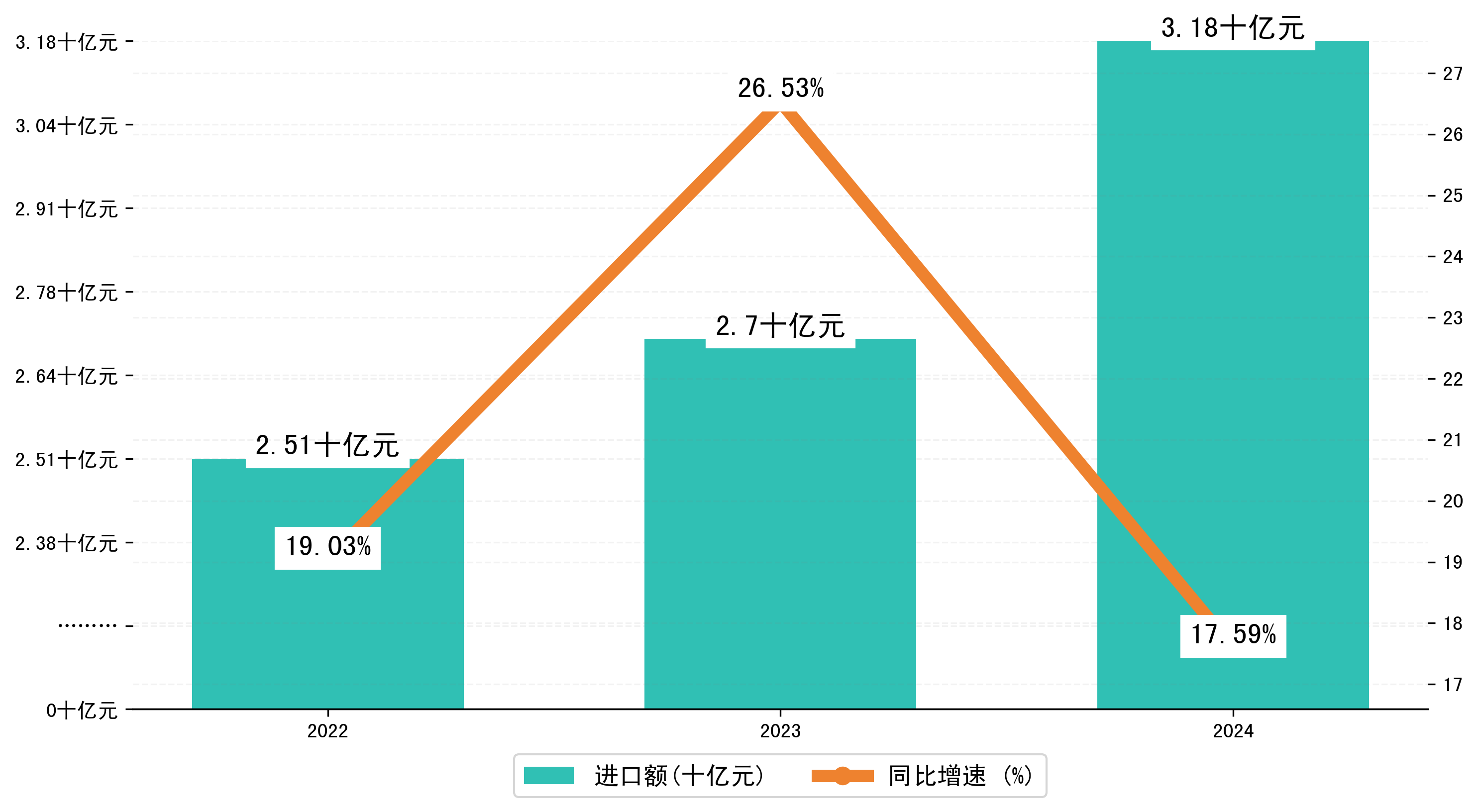 以美元计,2024年1-3月绥芬河市进口额为4,4748.8897万美元,相比上年同期增加了5628.2761万美元,同比增加13.80%。