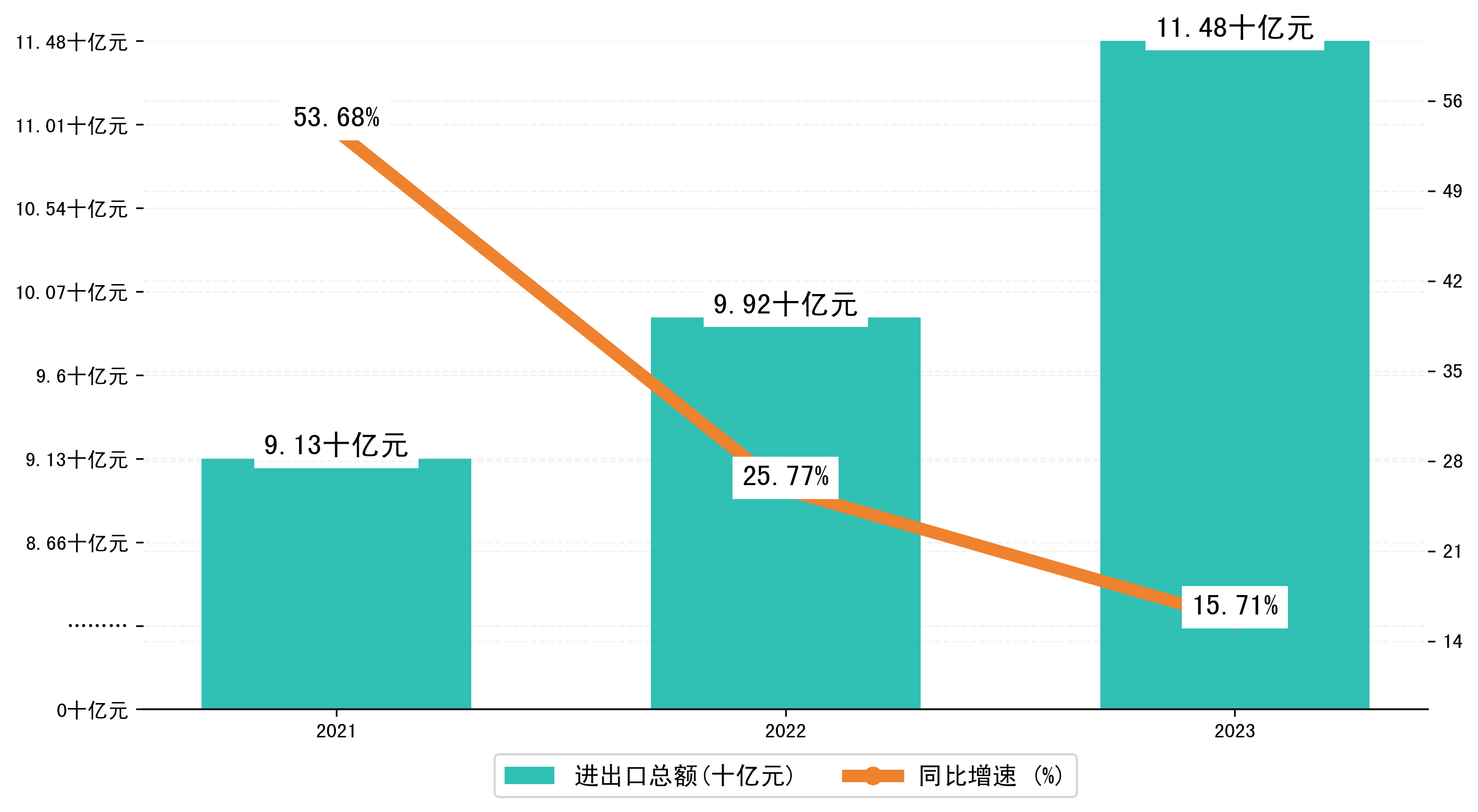 以人民币计,2023年1-7月绥芬河市进出口总额为114,8197.7869万元,相比上年同期增加了15,5860.2666万元,同比增加了15.90%。