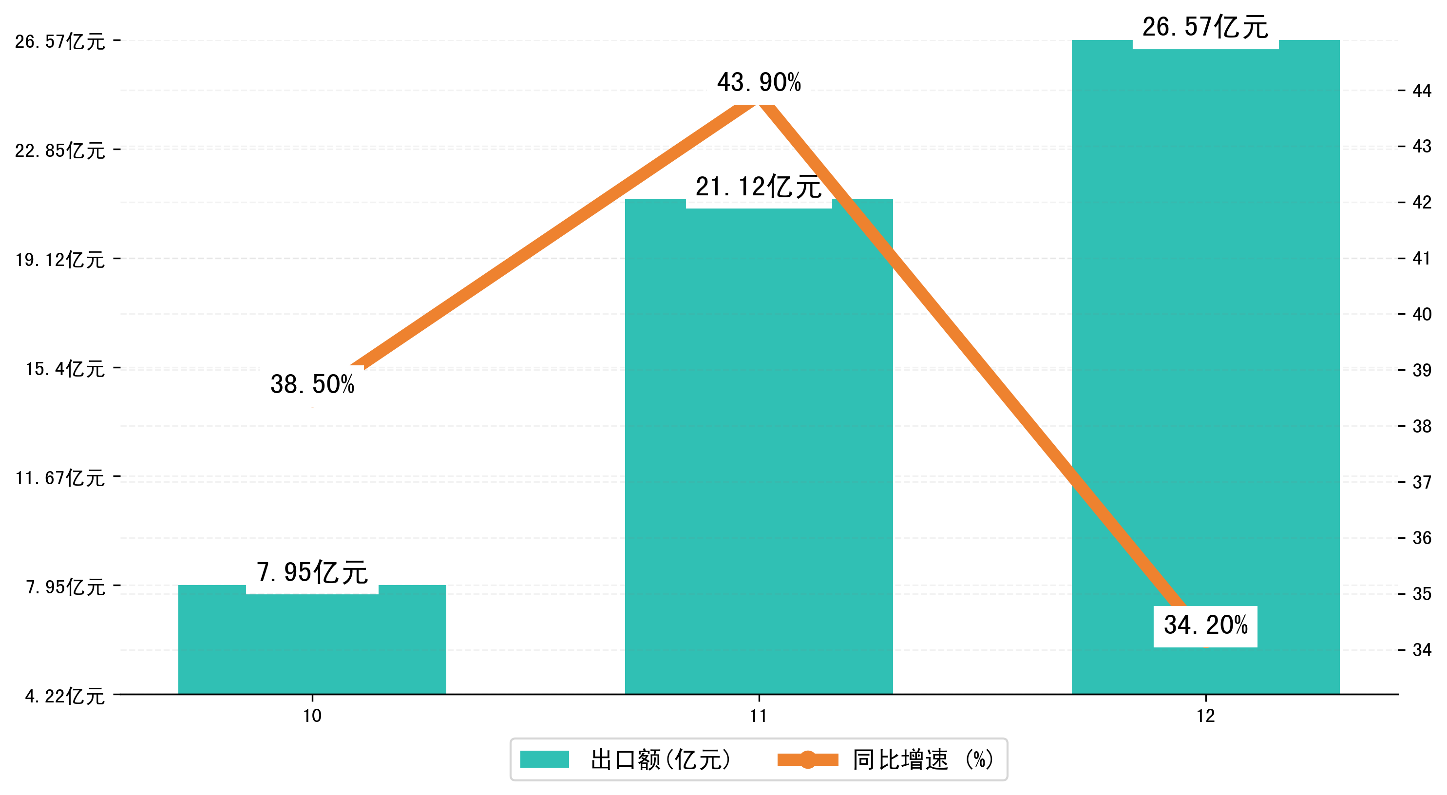 以美元计,2024年12月绥芬河市出口额为3,7100.0384万美元,相比上月增加了7435.562万美元;相比上年同期增加了134.8187万美元,同比增加33.40%。