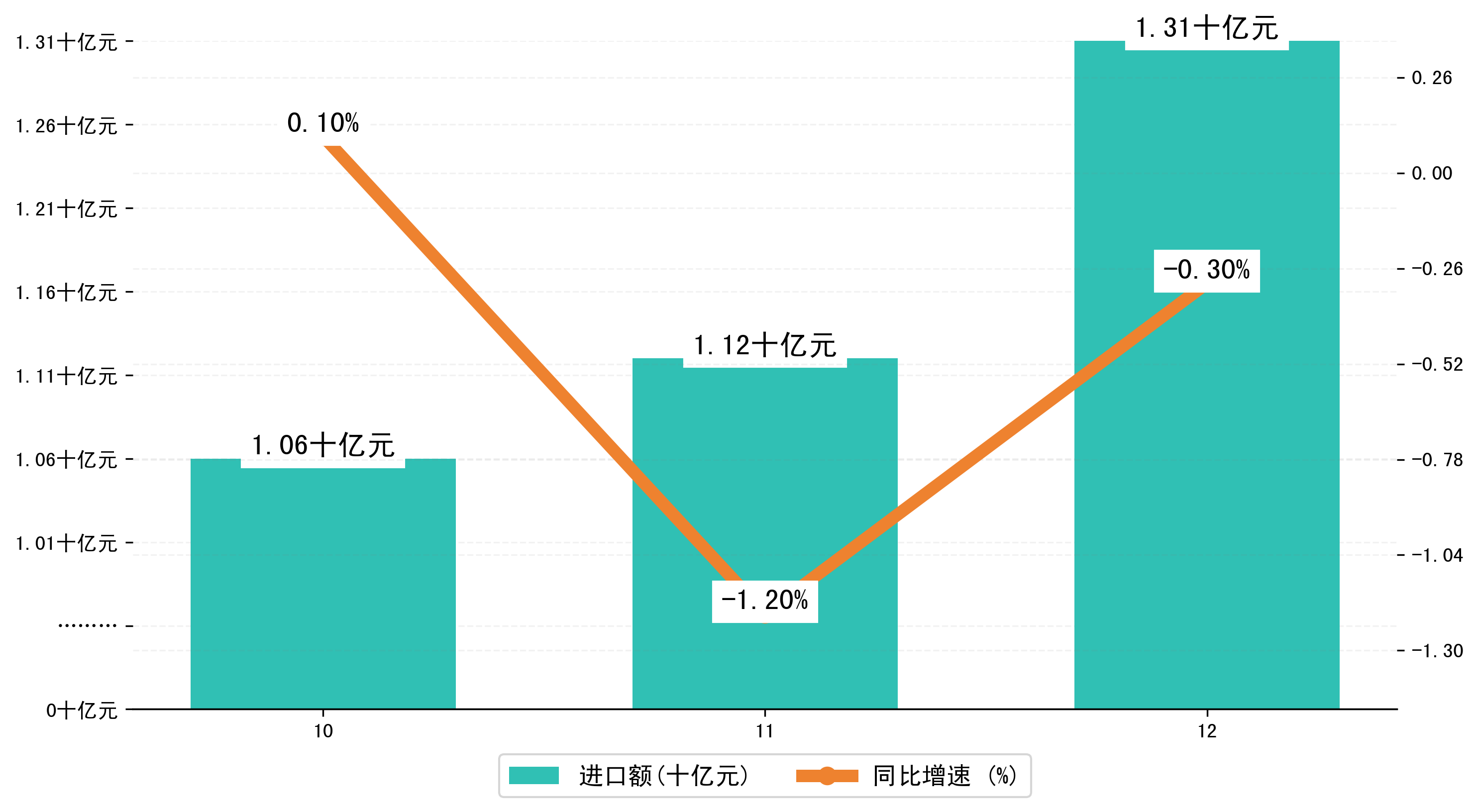 以人民币计,2024年12月绥芬河市进口额为13,1487.1005万元,相比上月增加了1,9417.8315万元;相比上年同期增加了8839.6729万元,同比减少了-0.30%。