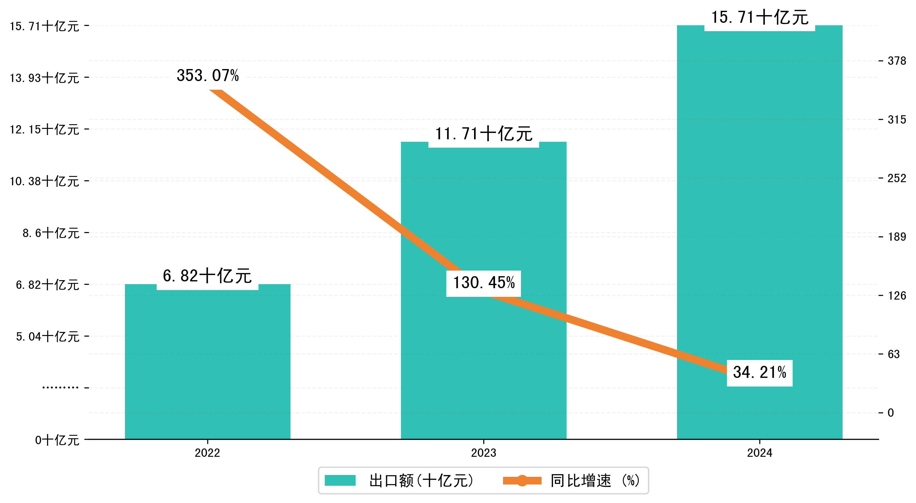 以人民币计,2024年1-12月绥芬河市出口额为157,1138.9174万元,相比上年同期增加了40,0514.5671万元,同比增加了34.20%。