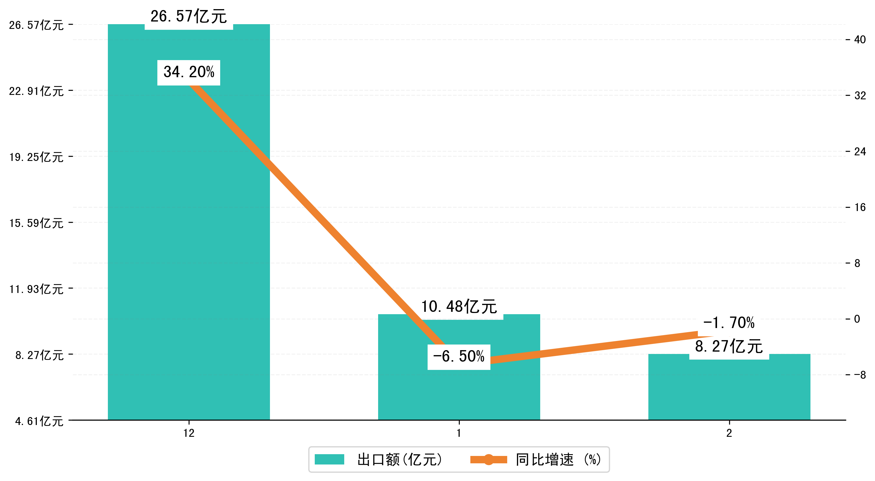 以美元计,2025年1-2月绥芬河市出口额为2,6104.892万美元,相比上年同期减少了924.8401万美元,同比减少-2.90%。