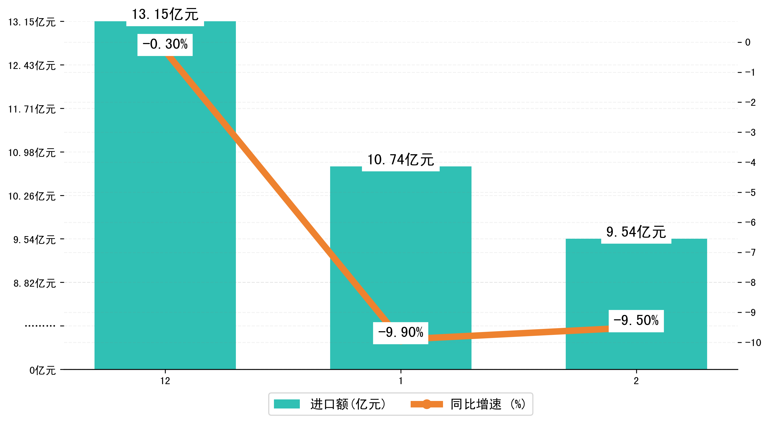 以美元计,2025年2月绥芬河市进口额为1,3347.0347万美元,相比上月减少了1499.0891万美元;相比上年同期减少了1564.3261万美元,同比减少-10.70%。
