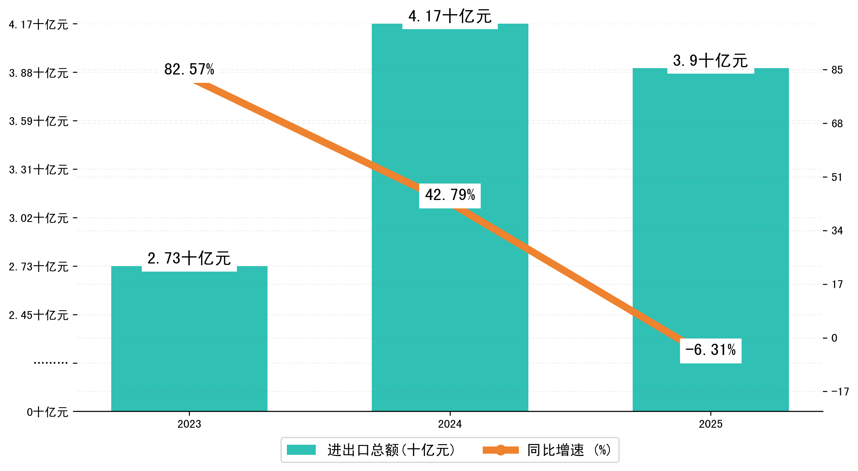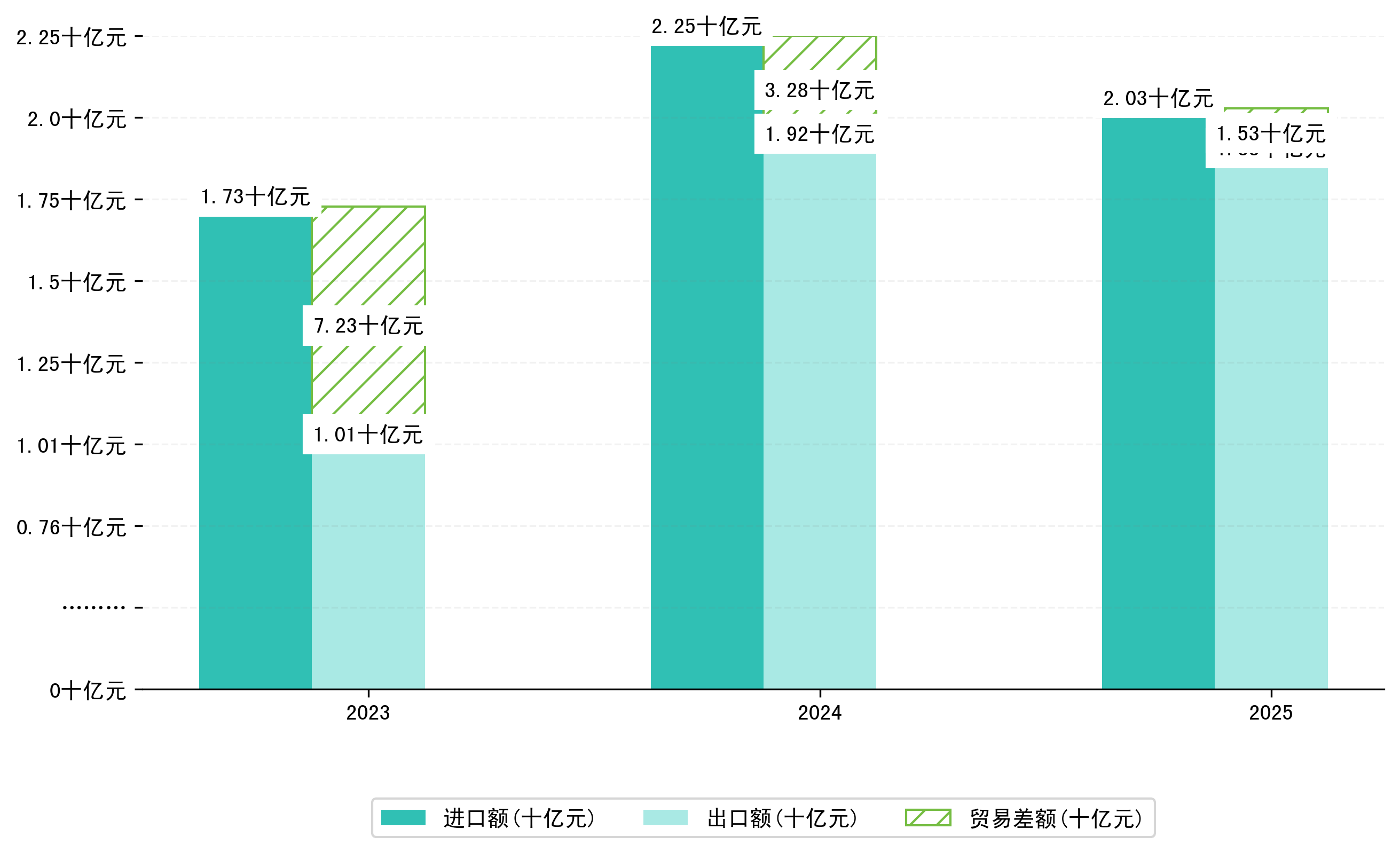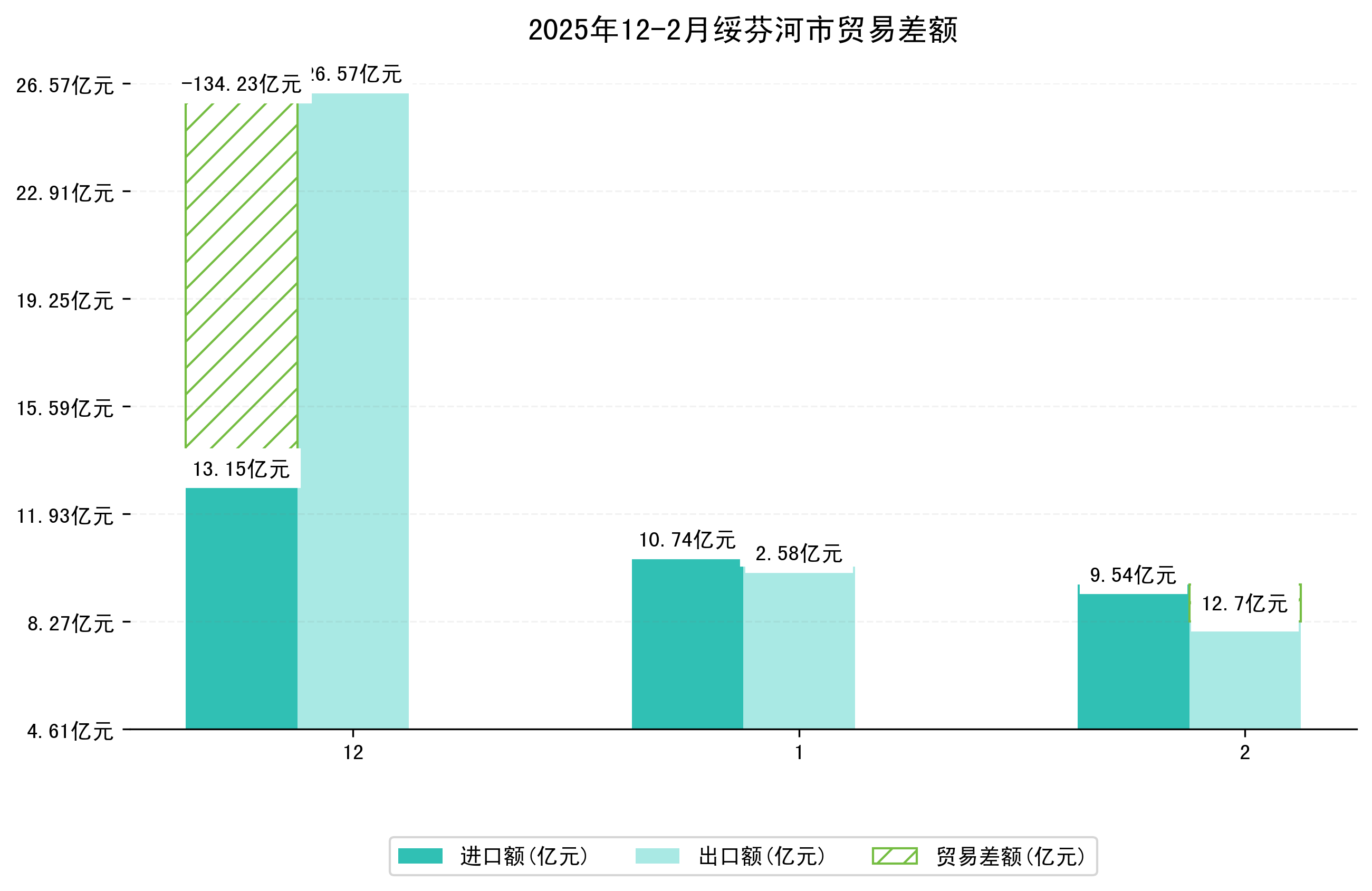 以人民币计,2025年2月绥芬河市贸易差额为1,2695,5701万元(贸易逆差),相比上月减少了1,0114,6304万元,即1555,6595万美元;相比上年同期增加了1,3560,5511万元,同比增加-51.65%。