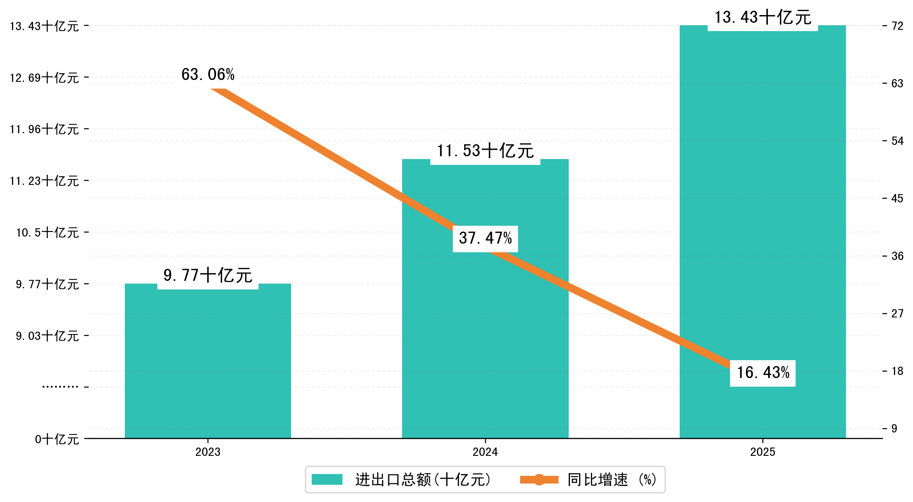 以美元计,2025年1-6月绥芬河市进出口总额为18,6942.5634万美元,相比上年同期增加了2,4518.5084万美元,同比增加14.70%。