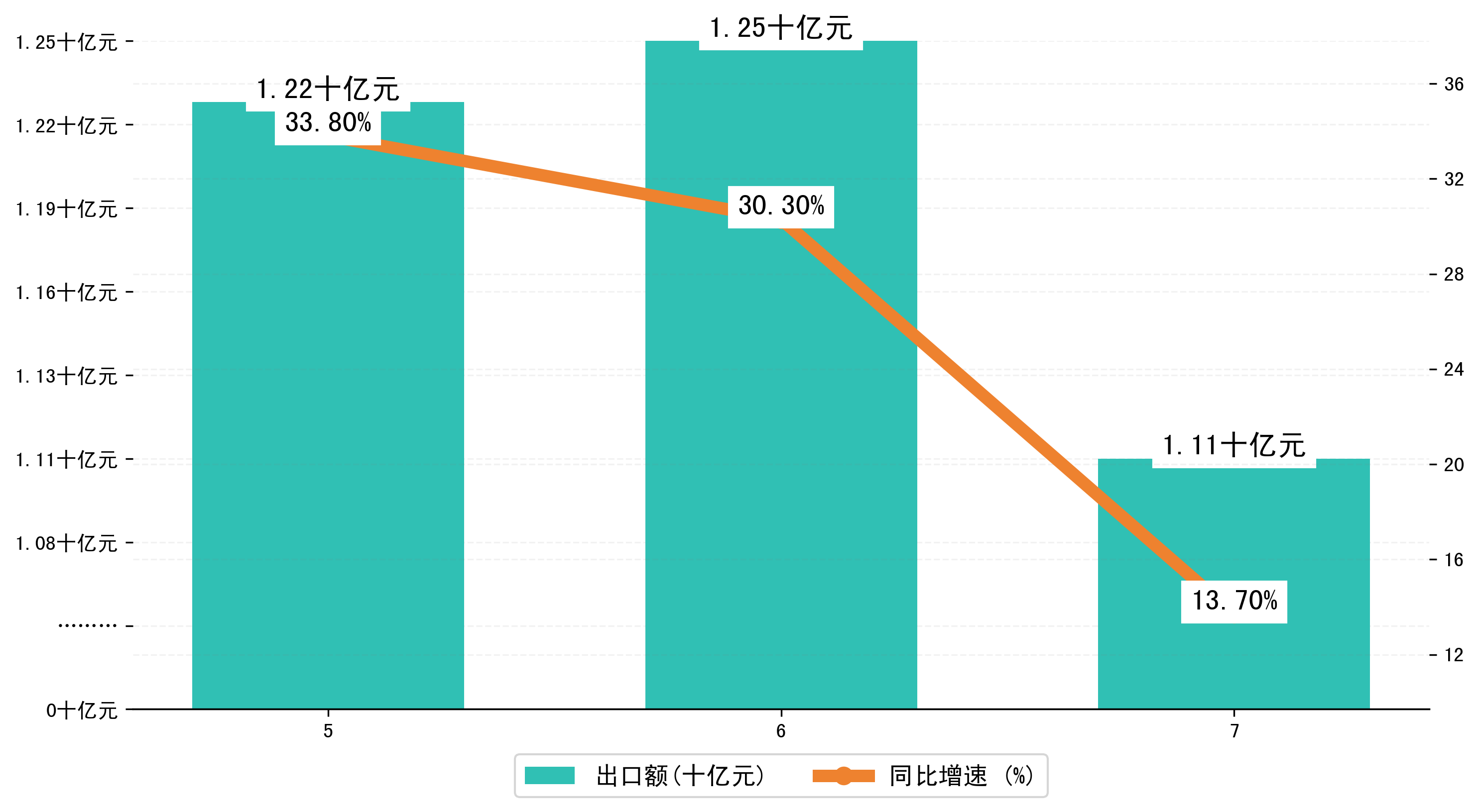 以美元计,2025年1-7月绥芬河市出口额为12,1210.5079万美元,相比上年同期增加了1,4217.9467万美元,同比增加12.50%。