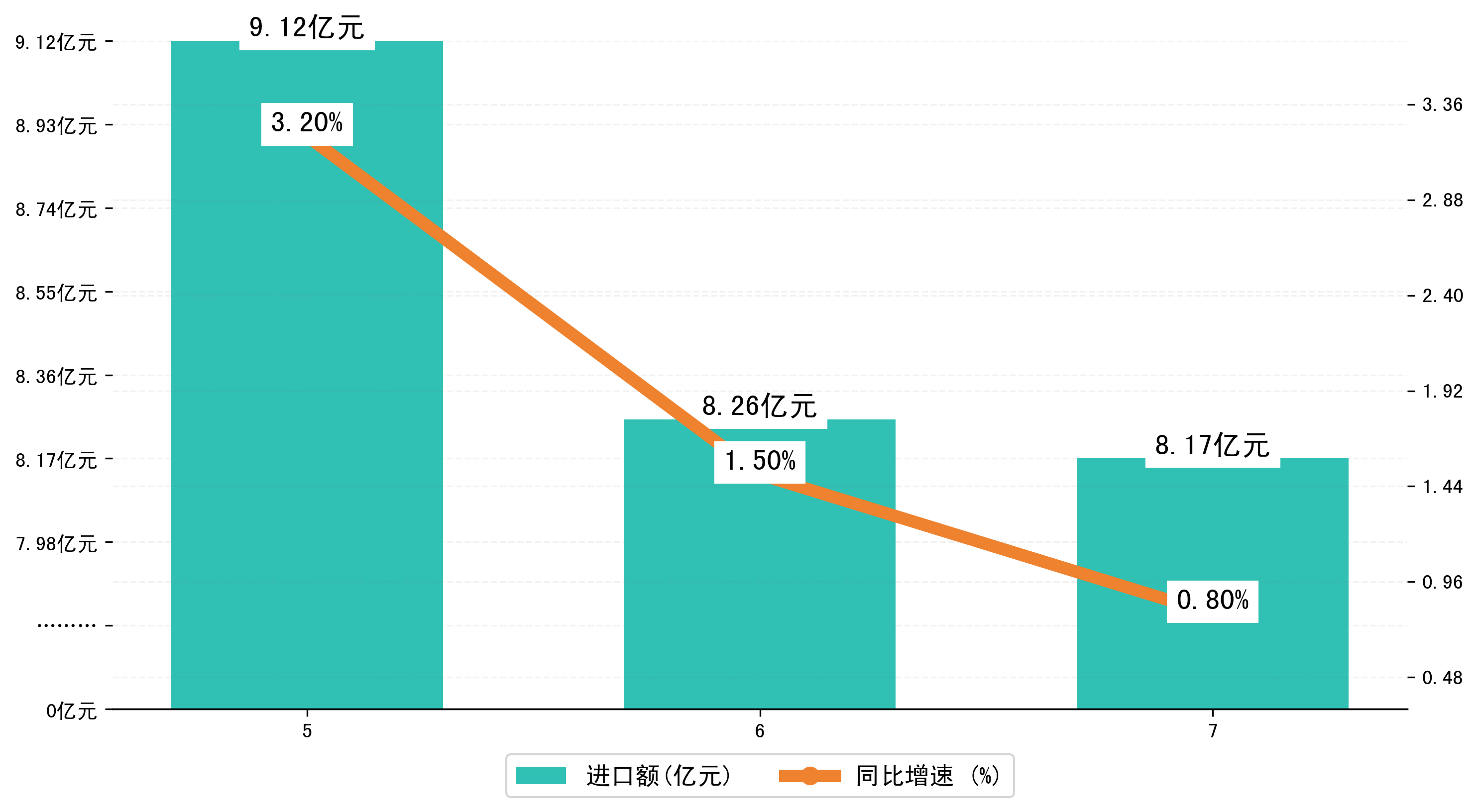 以美元计,2025年1-7月绥芬河市进口额为9,2517.136万美元,相比上年同期增加了421.6712万美元,同比增加-0.30%。