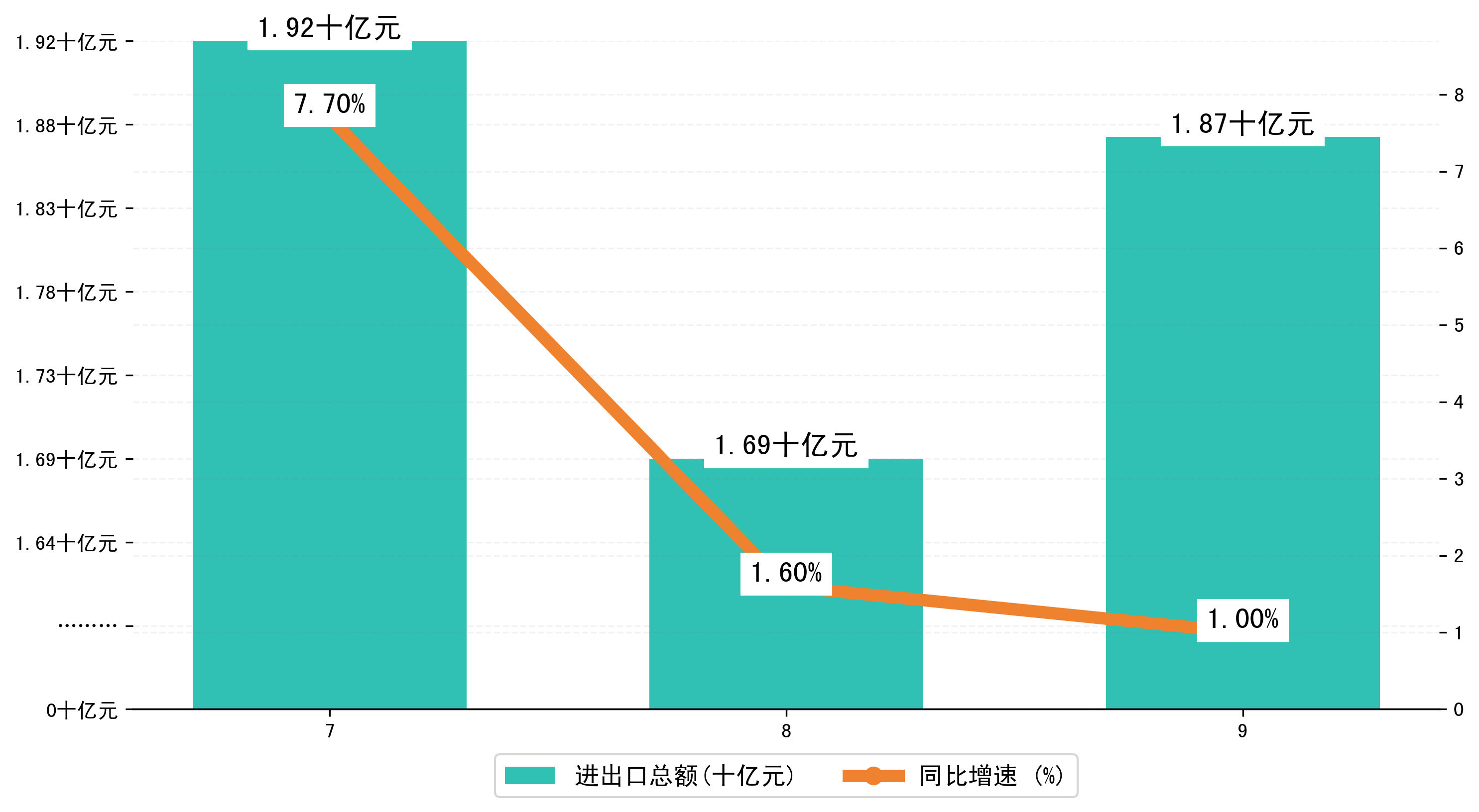 以美元计,2025年1-9月绥芬河市进出口总额为26,3488.9348万美元,相比上年同期增加了52.4168万美元,同比增加0.10%。