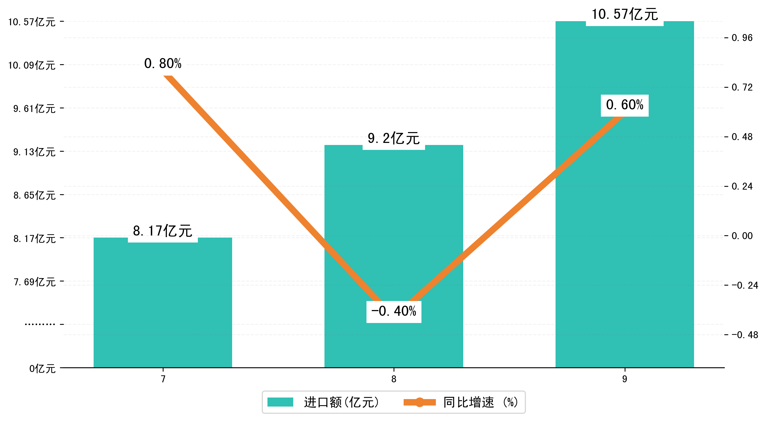 以美元计,2025年1-9月绥芬河市进口额为12,0182.0154万美元,相比上年同期增加了678.5528万美元,同比增加-0.40%。