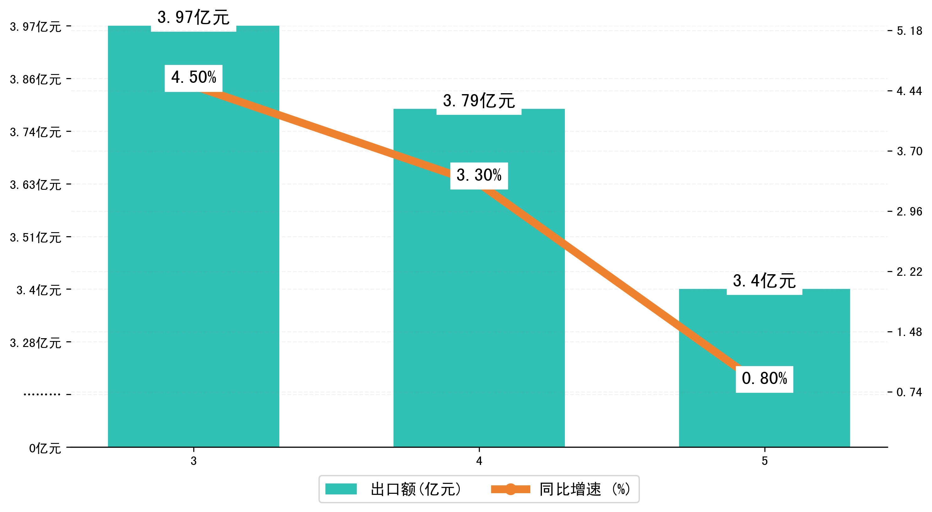 以人民币计,2025年5月绥化市出口额为3,3966.6535万元,相比上月减少了3942.0792万元;相比上年同期减少了3404.4584万元,同比增加了0.80%。