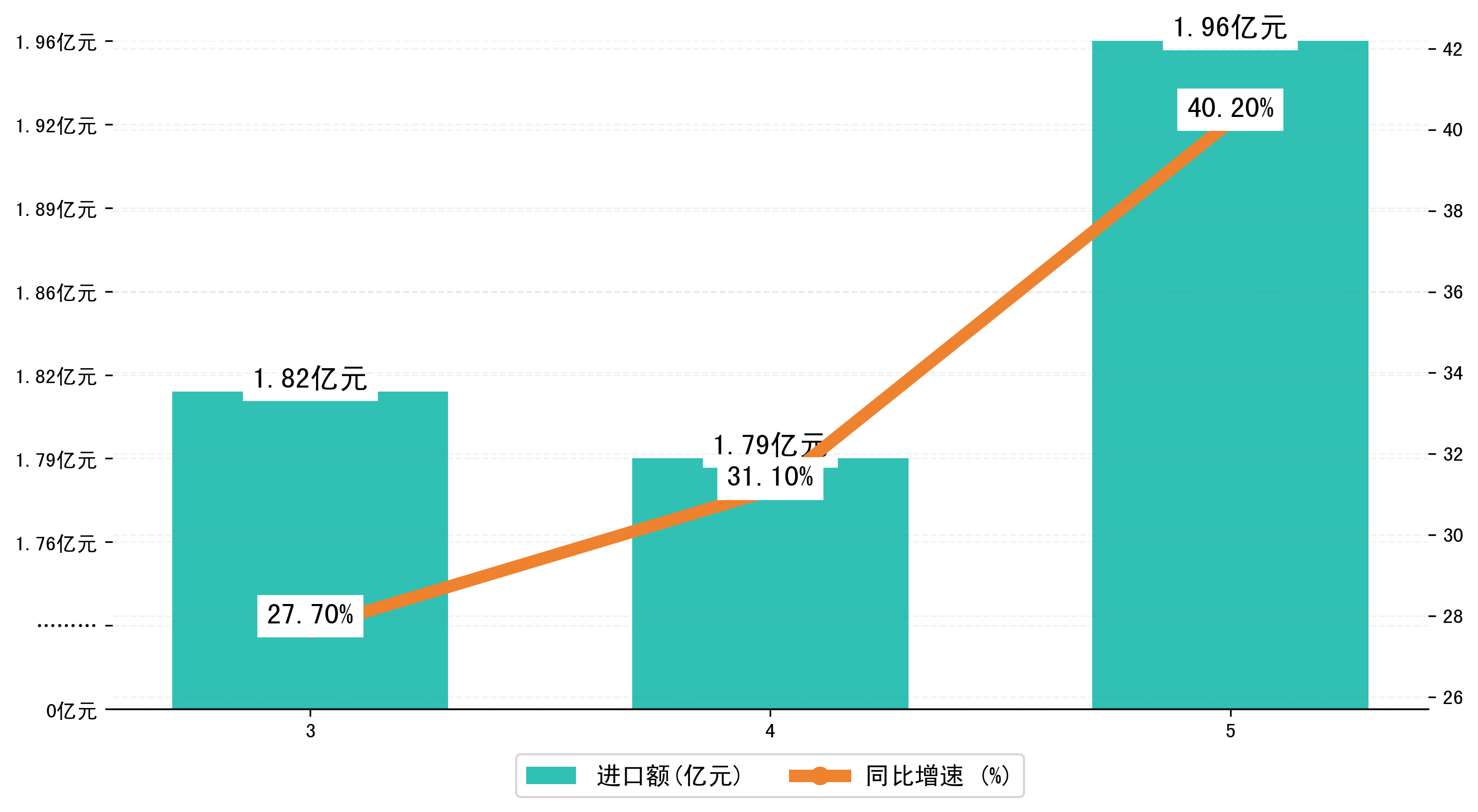 以人民币计,2025年1-5月绥化市进口额为7,2368.6426万元,相比上年同期增加了2,0758.4506万元,同比增加了40.20%。
