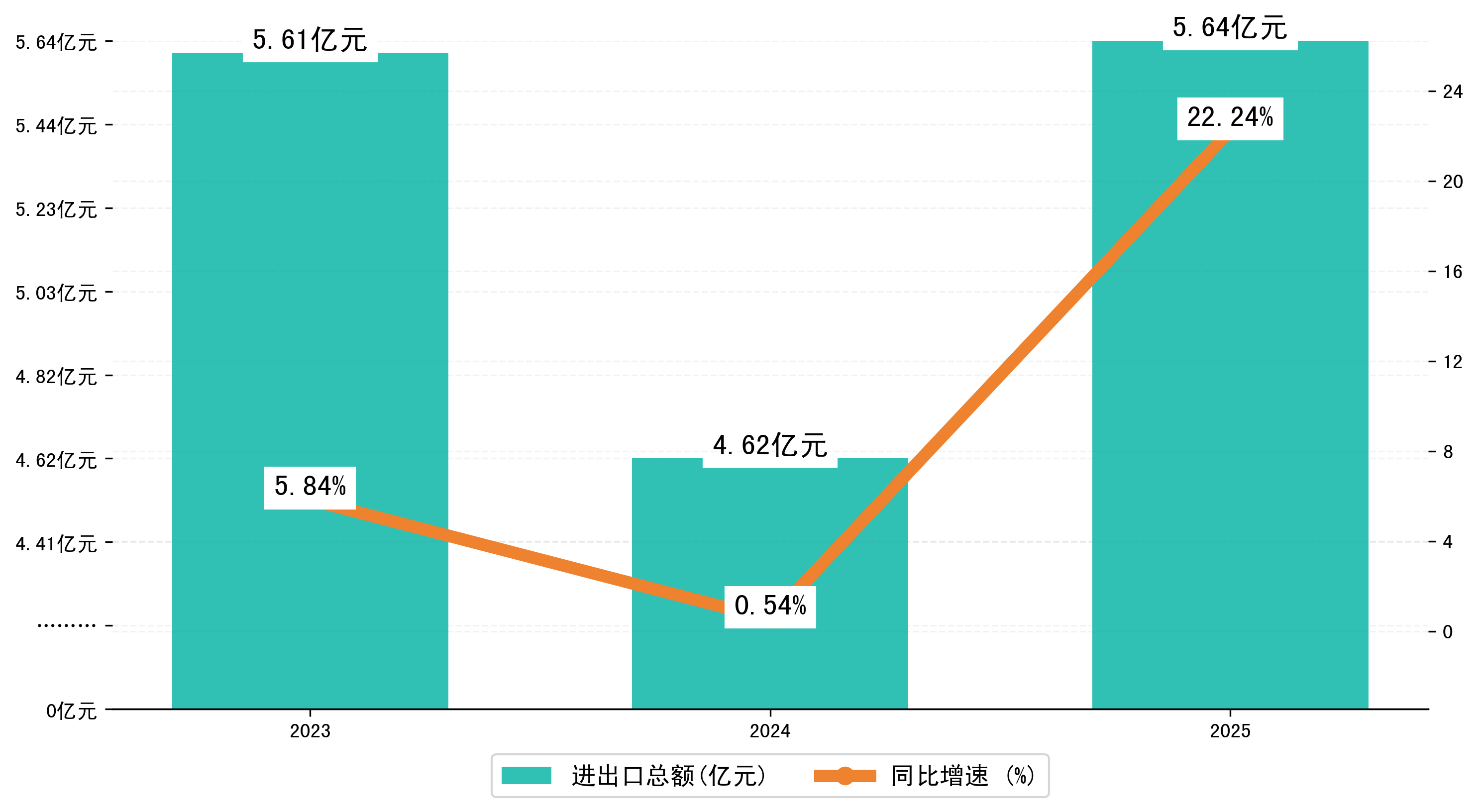 以人民币计,2025年1-1月绥化市进出口总额为5,6445.5026万元,相比上年同期增加了1,0267.6751万元,同比增加了22.20%。
