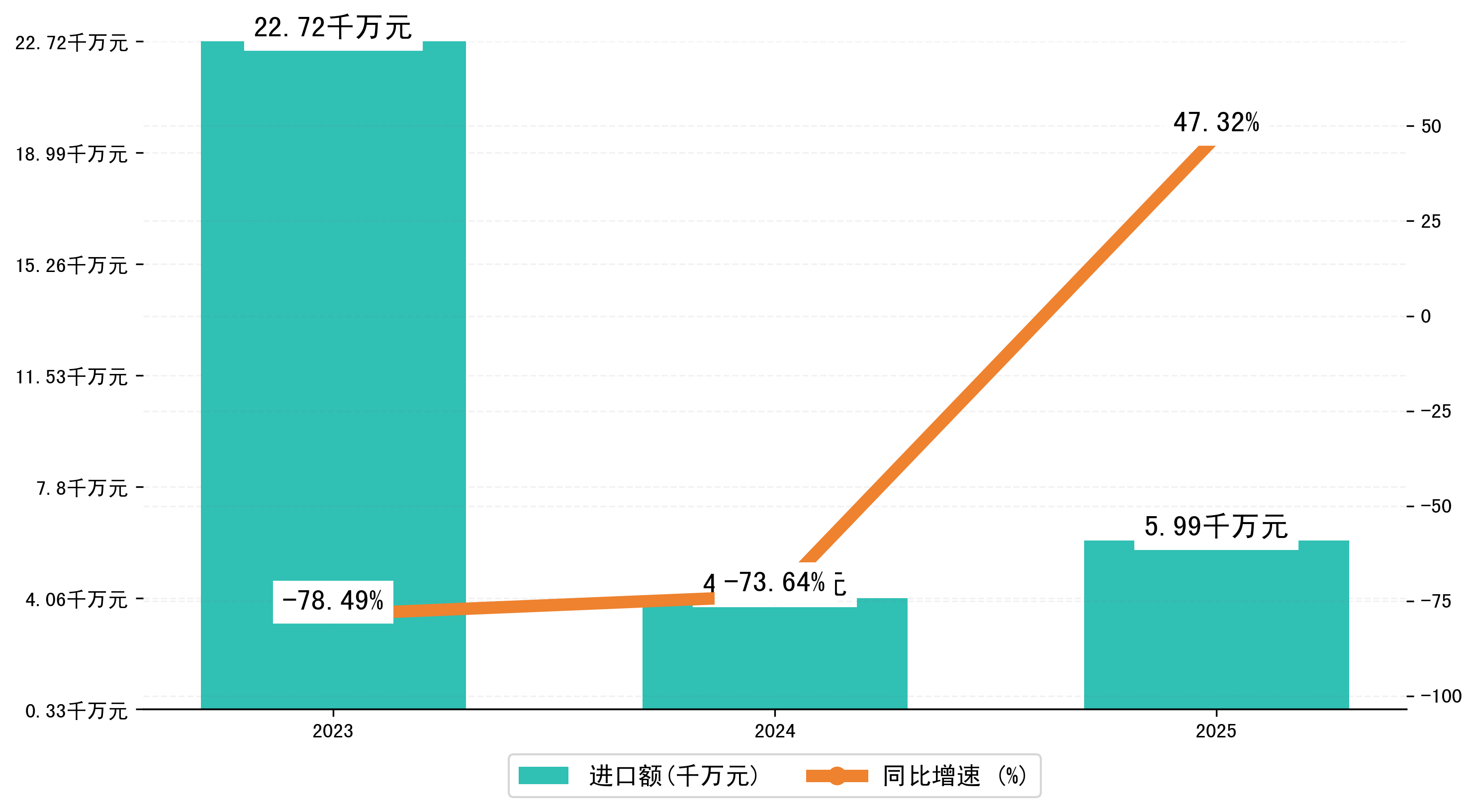 以人民币计,2025年1-1月绥化市进口额为5987.9061万元,相比上年同期增加了1923.2603万元,同比增加了47.30%。
