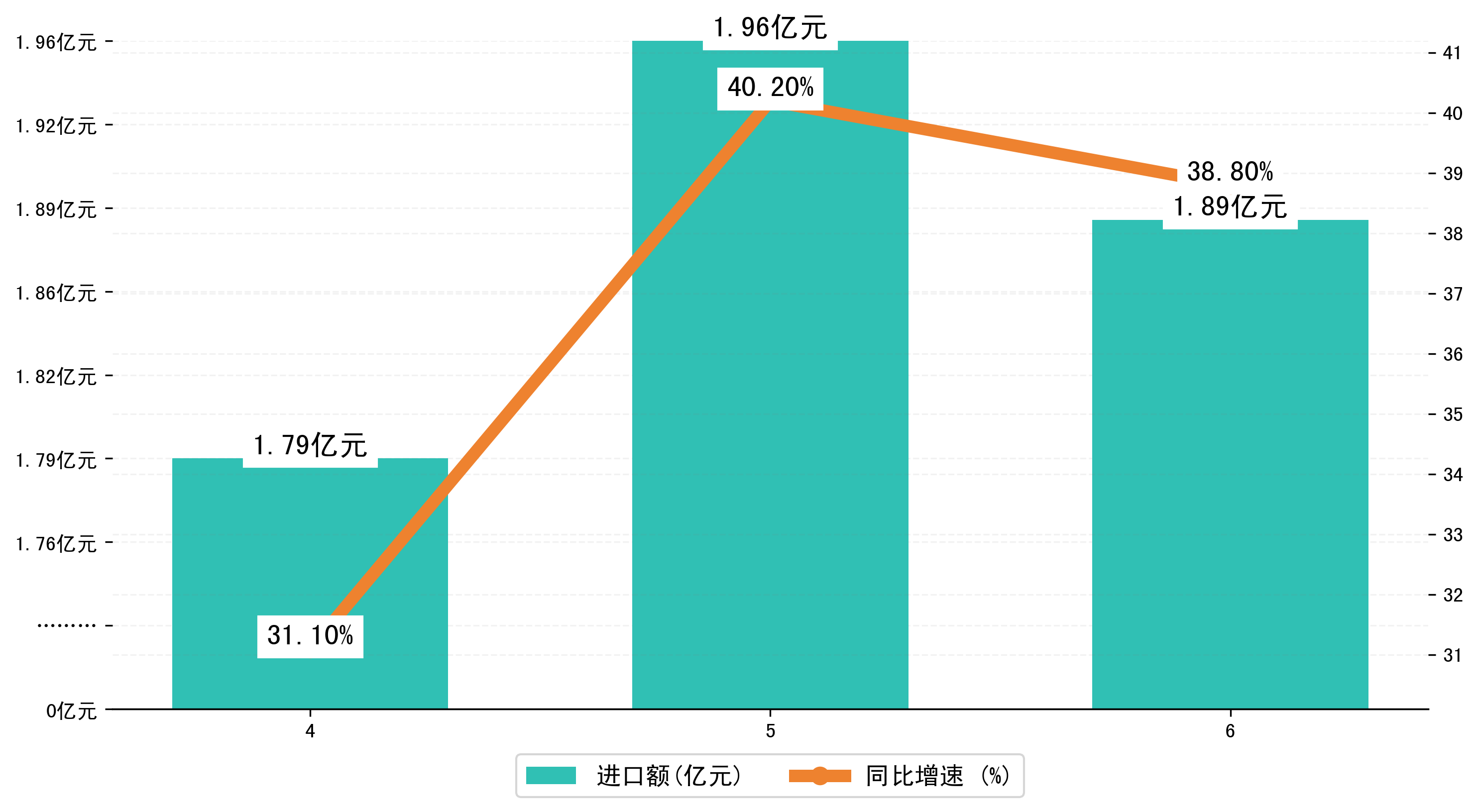 以人民币计,2025年1-6月绥化市进口额为9,1232.1943万元,相比上年同期增加了2,5517.3318万元,同比增加了38.80%。