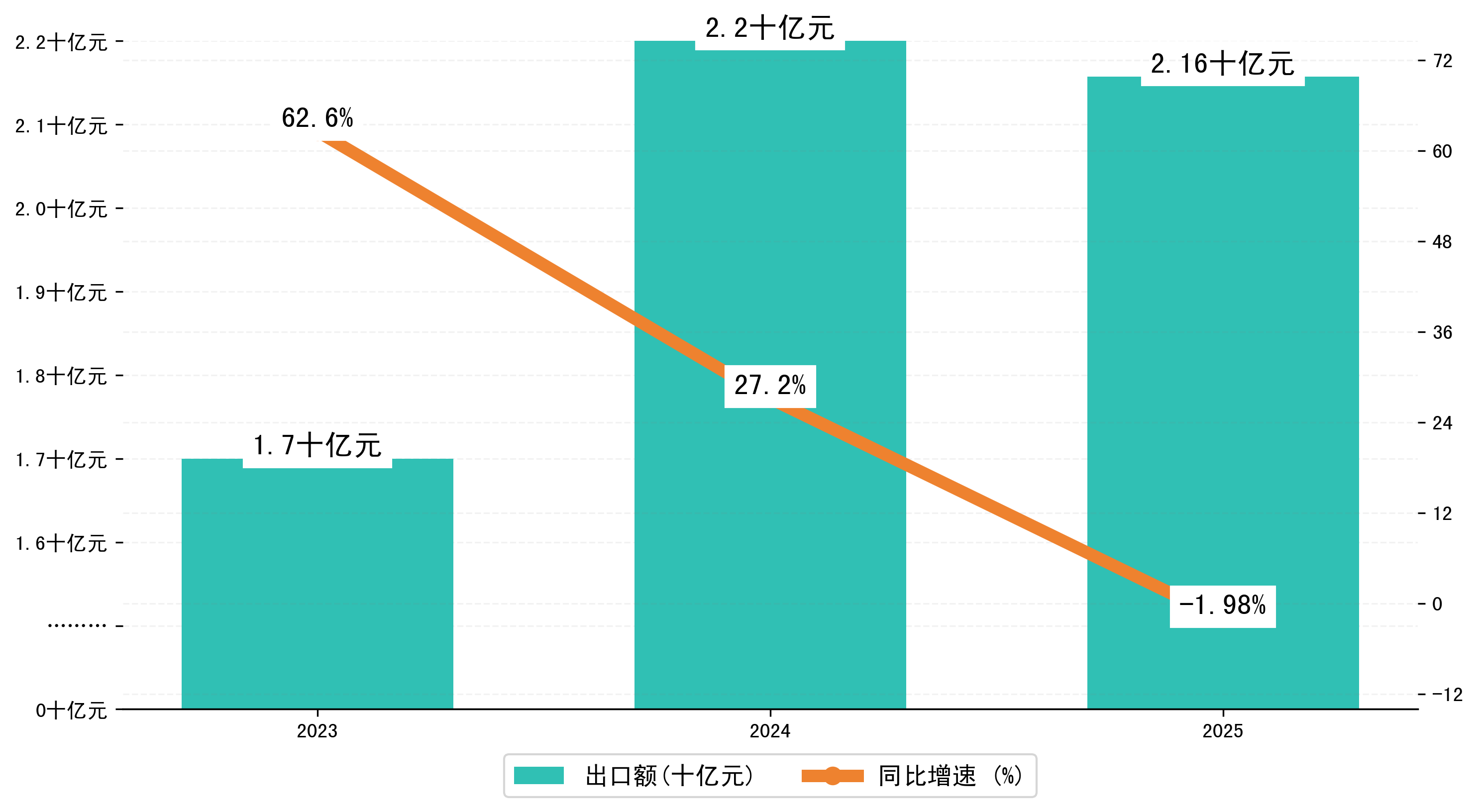 以人民币计,2025年1-6月绥化市出口额为21,5872.921万元,相比上年同期减少了4353.7861万元,同比减少了-2.00%。