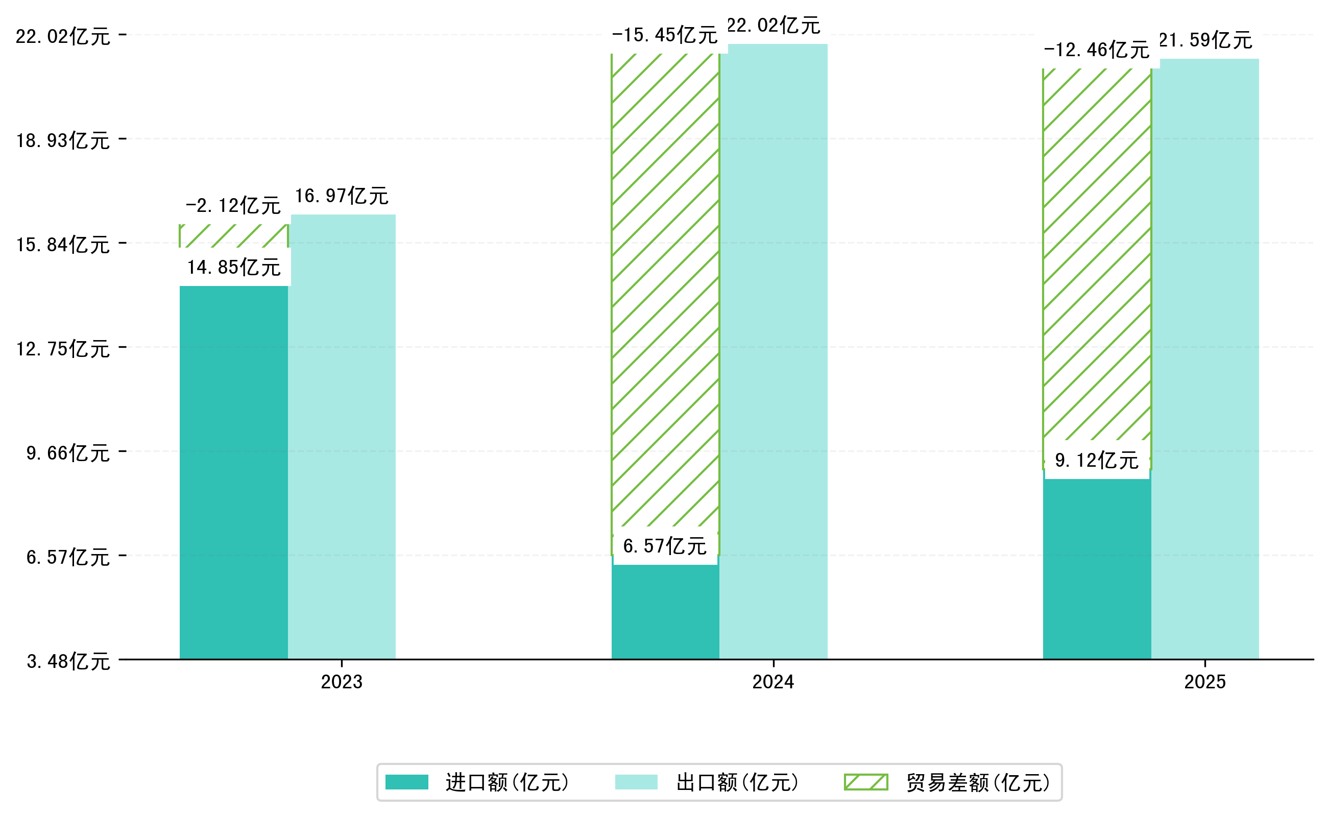 以美元计,2025年1-6月绥化市贸易差额为1,7332,8115万美元(贸易顺差),相比上年同期减少了4414,1796万美元,同比减少-20.3%。