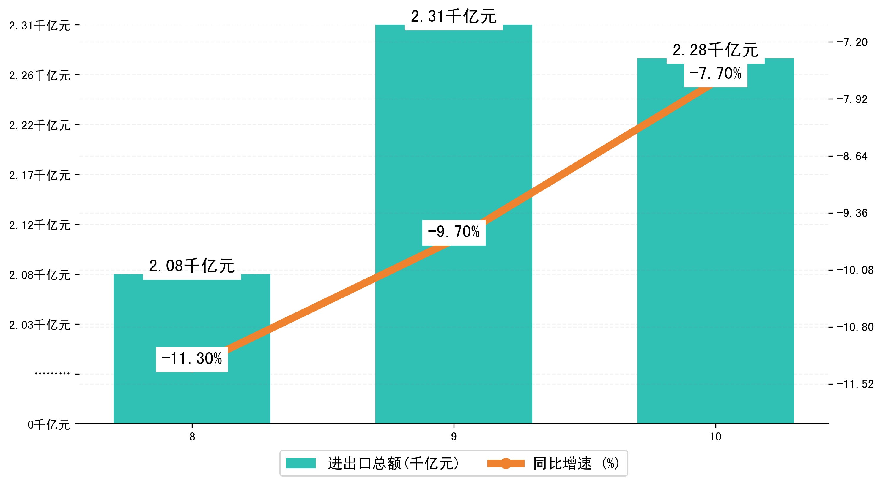 以人民币计,2023年10月苏州市进出口总额为2278,1910.4302万元,相比上月减少了31,3733.5053万元;相比上年同期增加了233,5811.9948万元,同比减少了-7.70%。