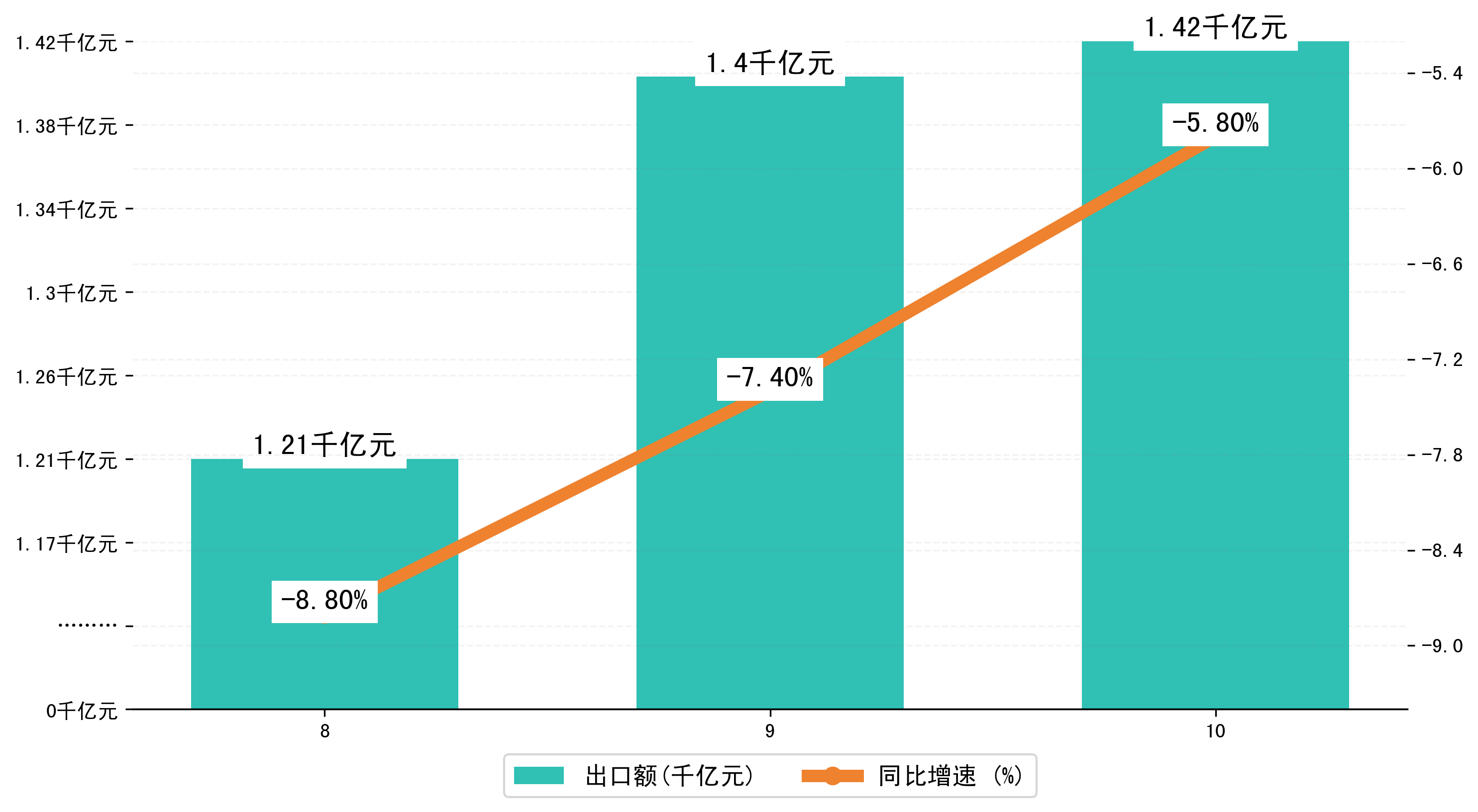 以人民币计,2023年10月苏州市出口额为1419,3671.6369万元,相比上月增加了17,4777.2139万元;相比上年同期增加了115,7975.44万元,同比减少了-5.80%。