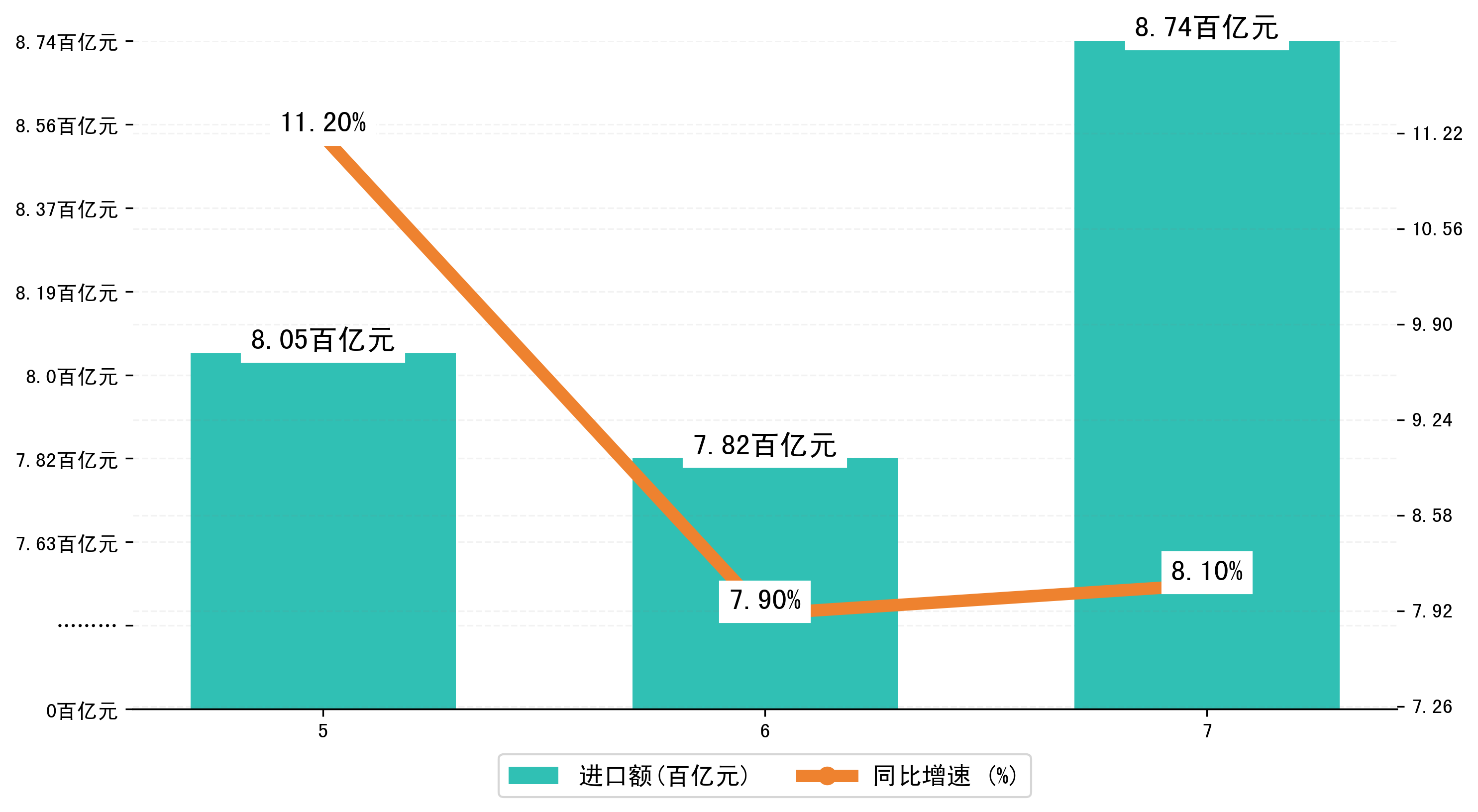 以人民币计,2024年7月苏州市进口额为874,3393.247万元,相比上月增加了92,6580.0912万元;相比上年同期增加了76,4417.1776万元,同比增加了8.10%。