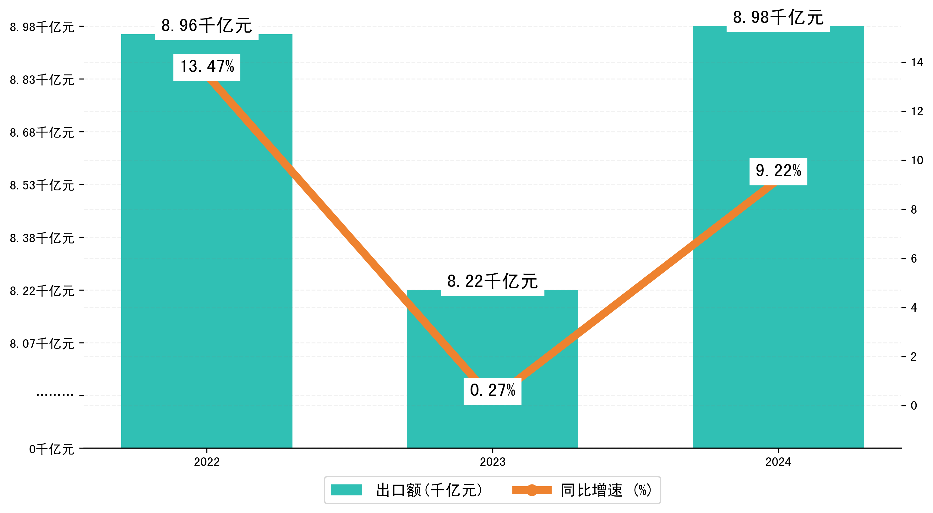 以人民币计,2024年1-7月苏州市出口额为8982,2837.5562万元,相比上年同期增加了758,4081.1916万元,同比增加了9.40%。