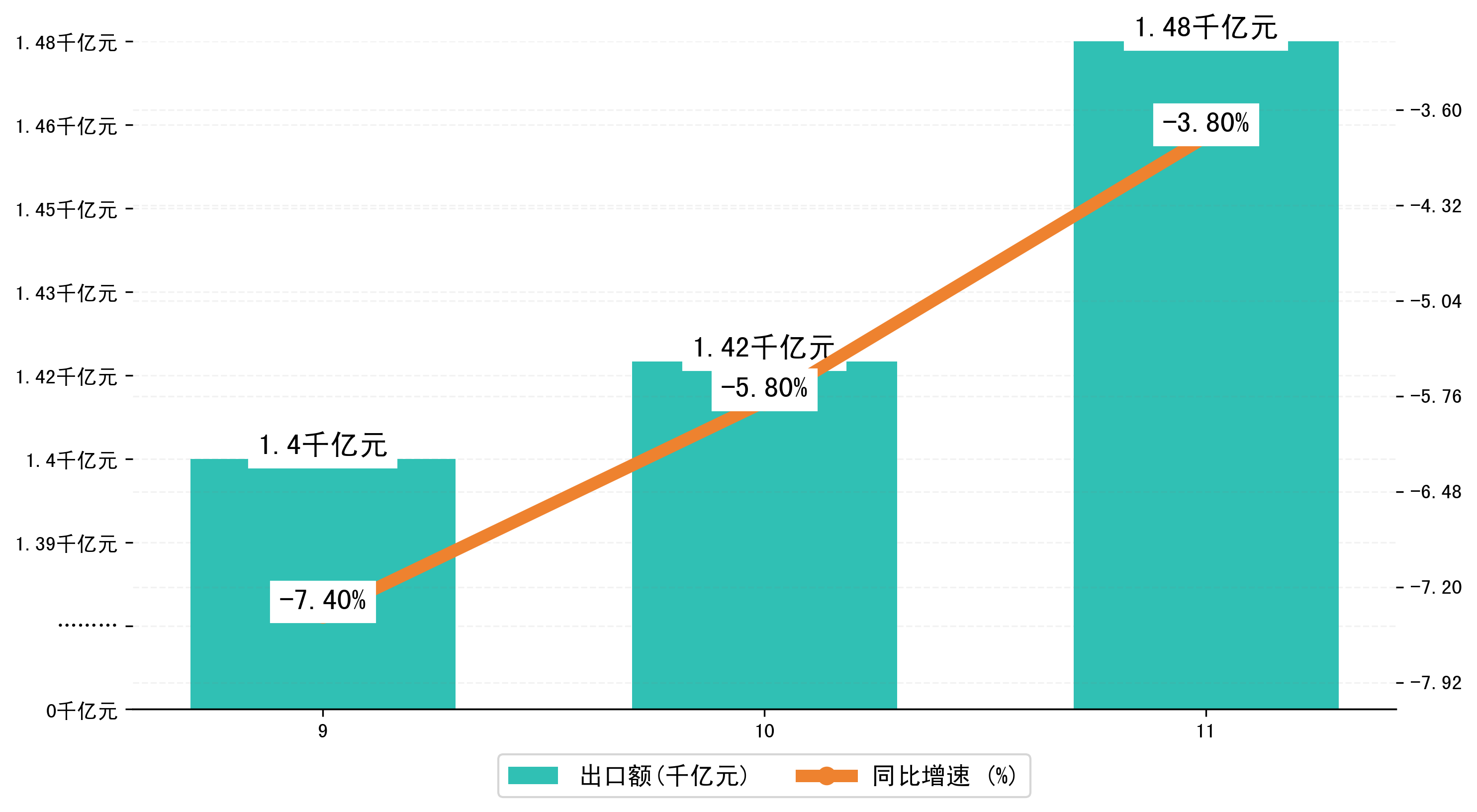 以人民币计,2023年11月苏州市出口额为1476,8771.5891万元,相比上月增加了57,5099.9522万元;相比上年同期增加了208,0465.6106万元,同比减少了-3.80%。