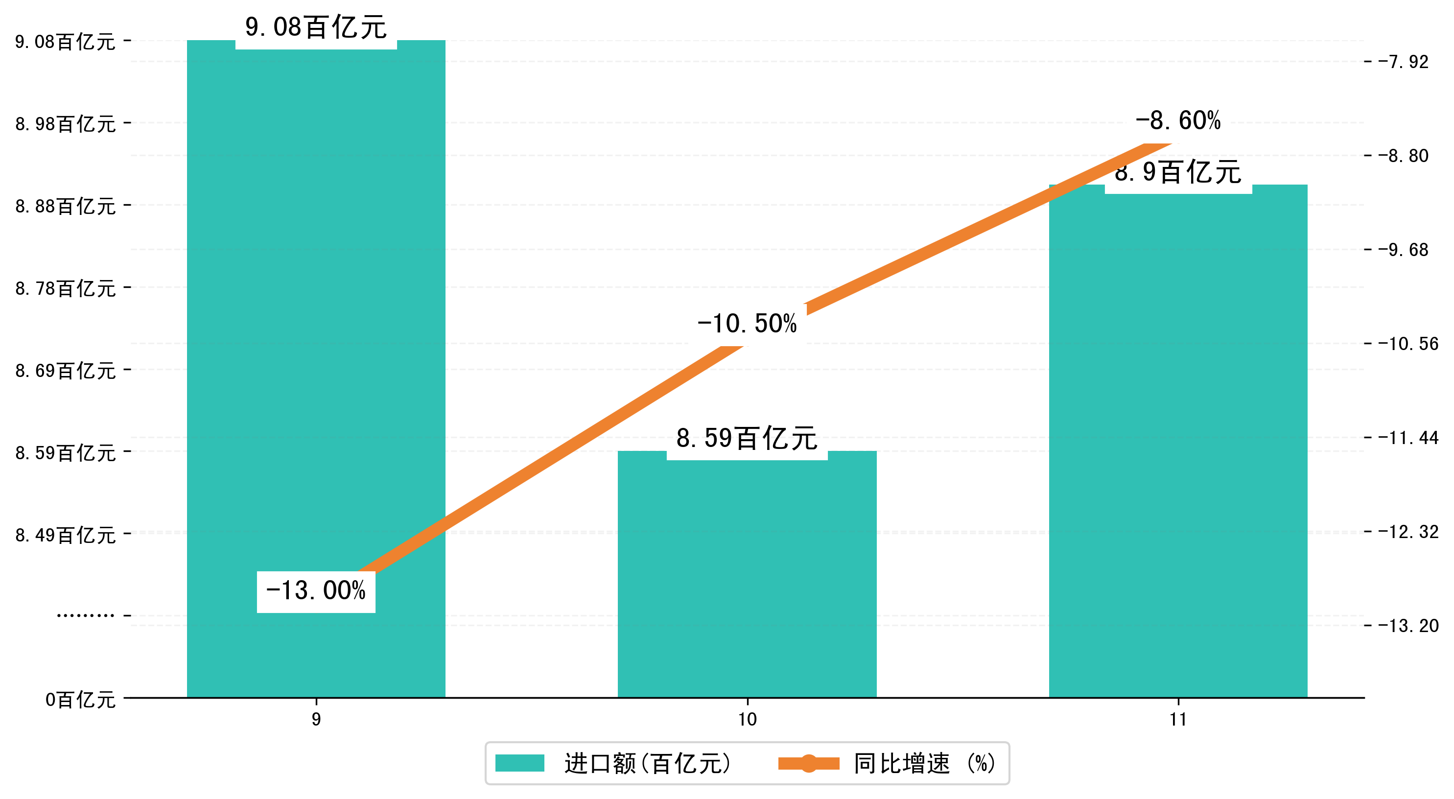 以人民币计,2023年11月苏州市进口额为890,4952.886万元,相比上月增加了31,6714.0928万元;相比上年同期增加了101,5412.1149万元,同比减少了-8.60%。