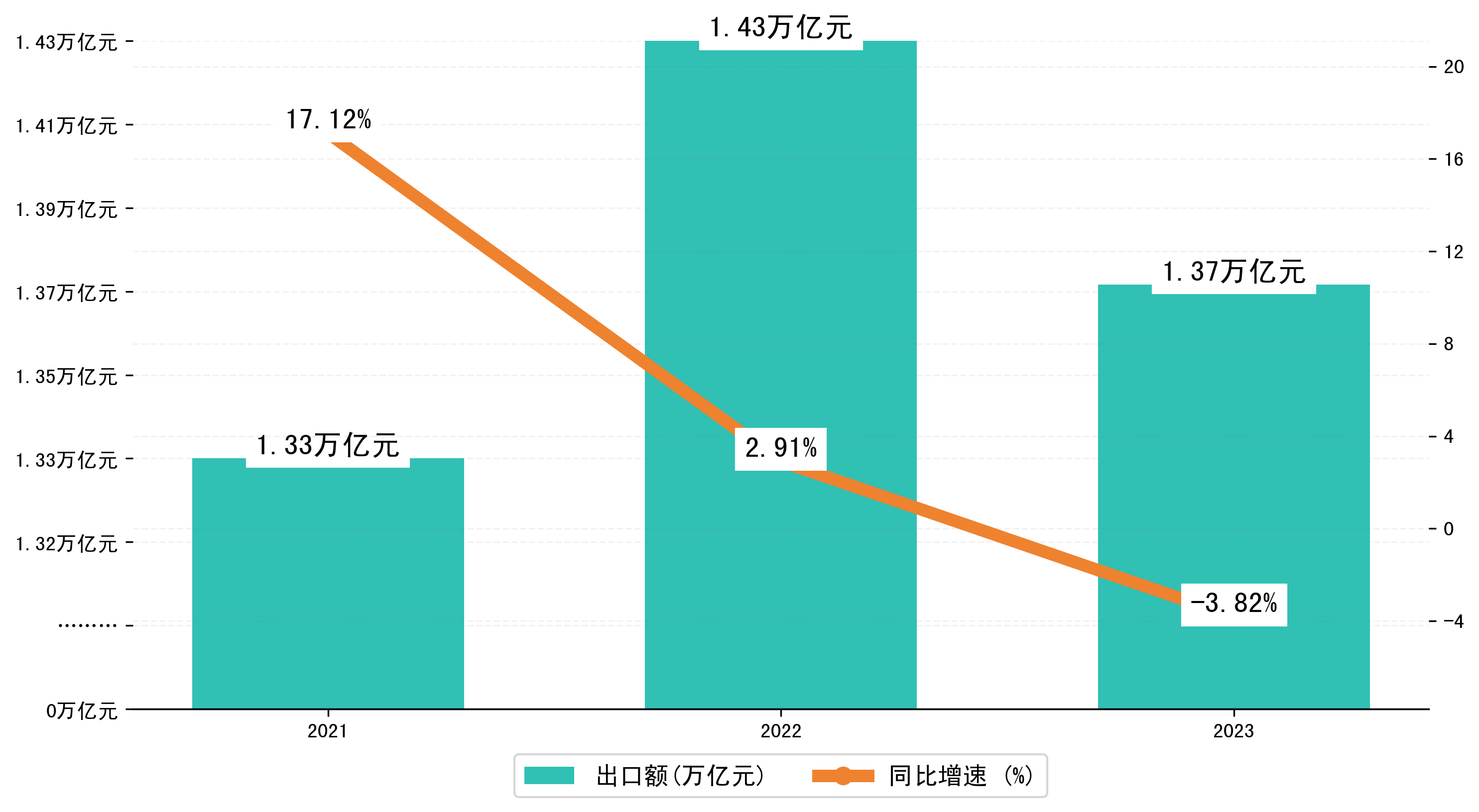 以人民币计,2023年1-11月苏州市出口额为1,3725,3001.635万元,相比上年同期减少了545,3433.5825万元,同比减少了-3.80%。
