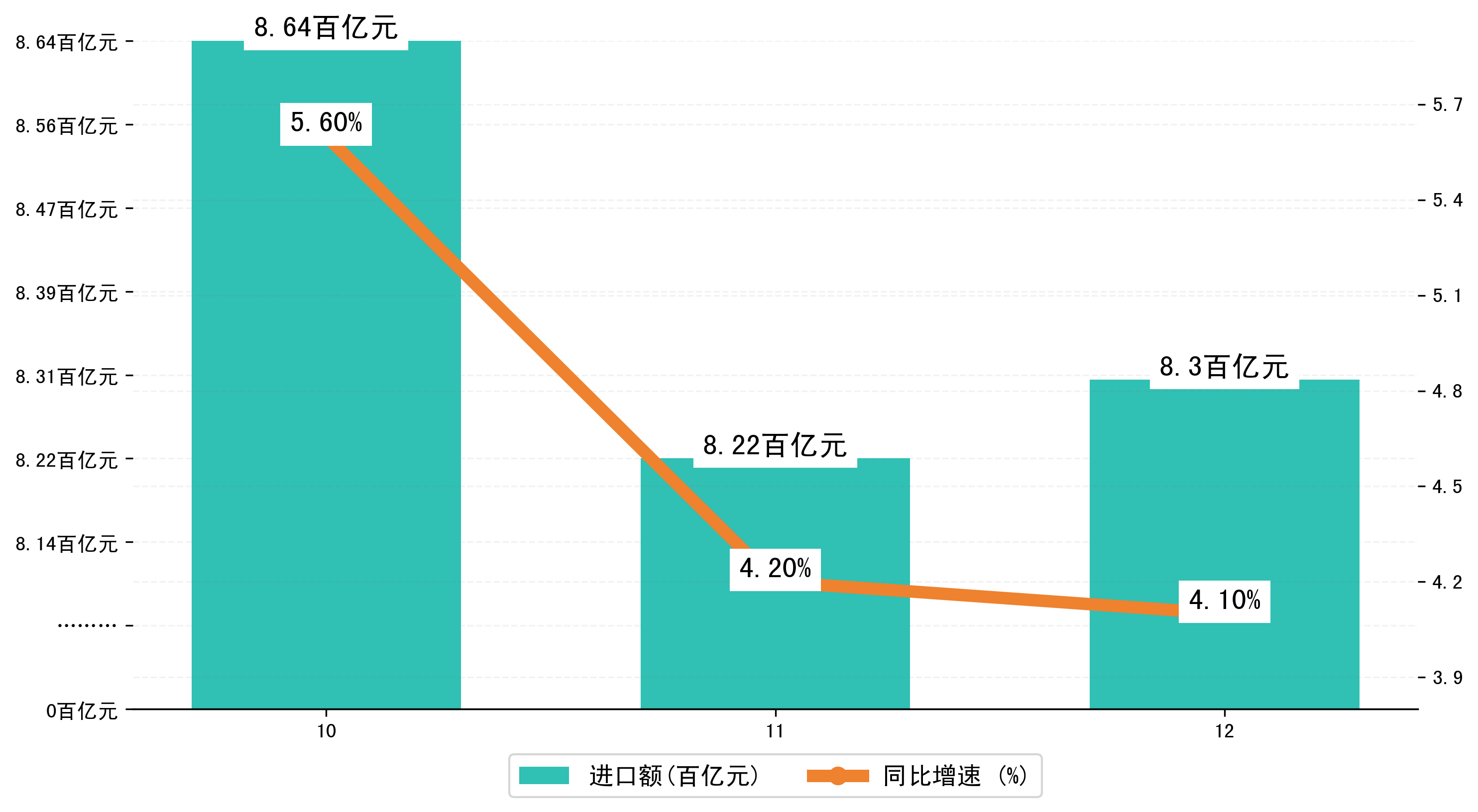 以人民币计,2024年12月苏州市进口额为830,0352.783万元,相比上月增加了7,9857.839万元;相比上年同期增加了42,4395.6128万元,同比增加了4.10%。