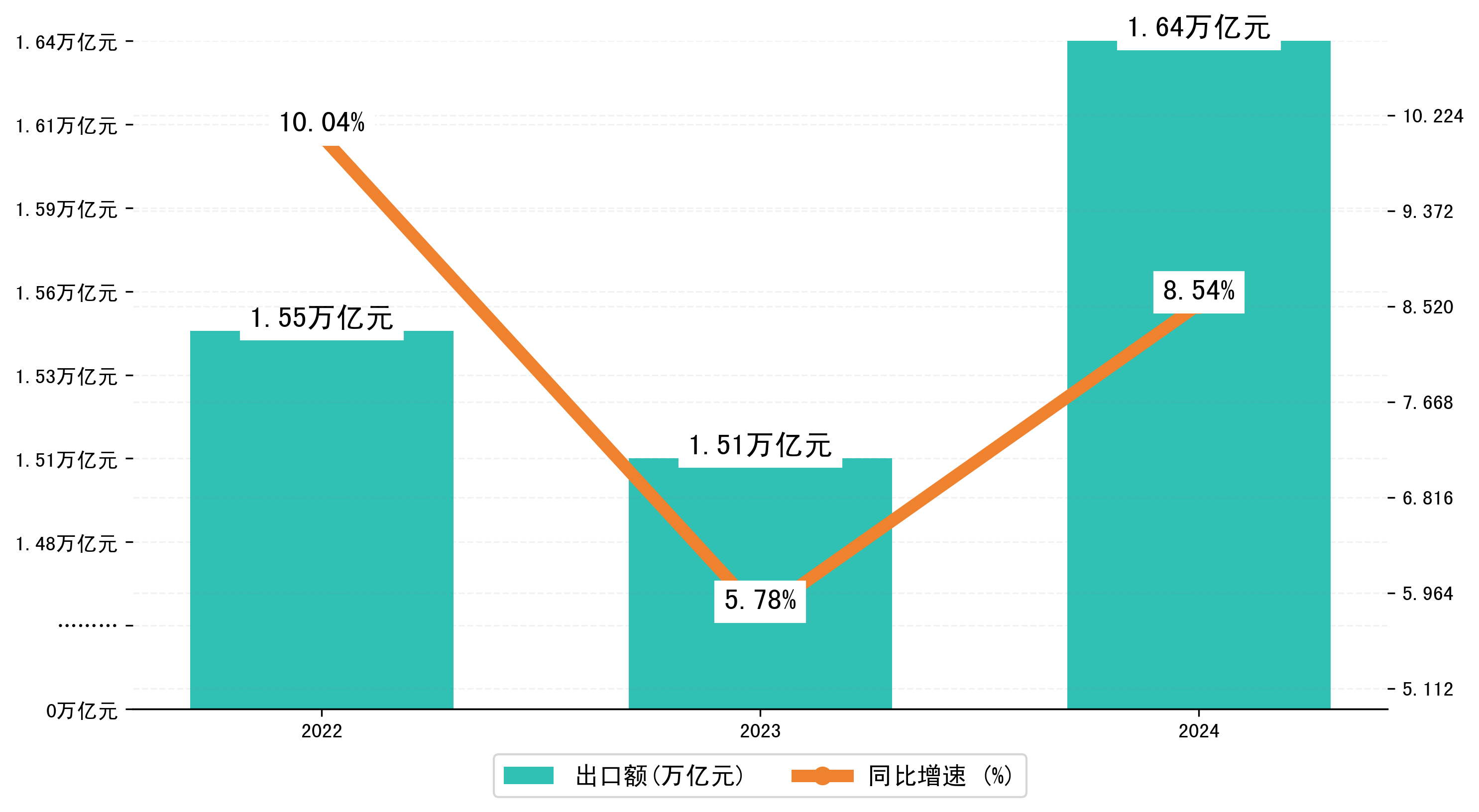 以人民币计,2024年1-12月苏州市出口额为1,6368,8121.5934万元,相比上年同期增加了1287,2221.7446万元,同比增加了8.50%。