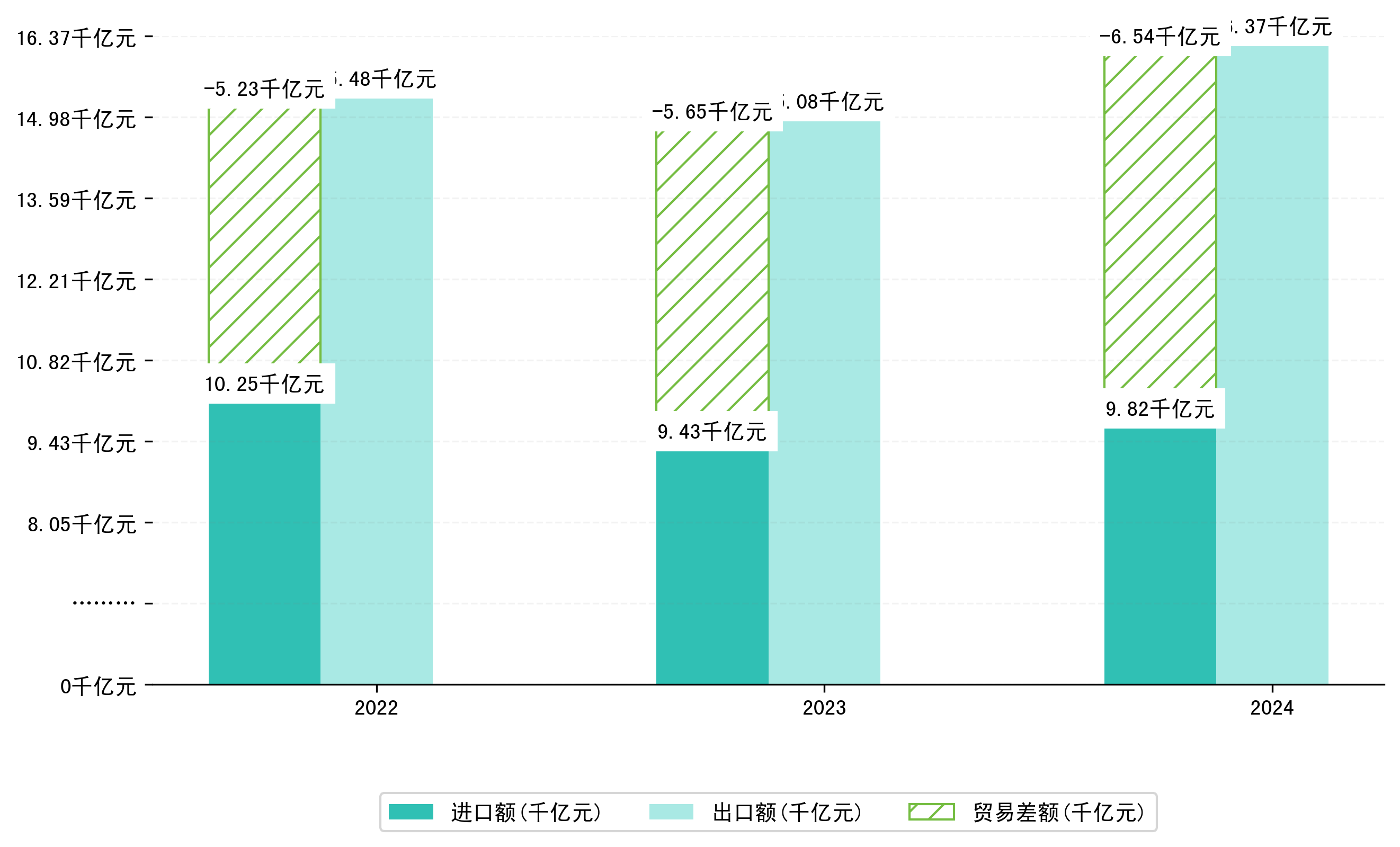 以人民币计,2024年1-12月苏州市贸易差额为6544,5152,3621万元(贸易顺差),相比上年同期增加了895,4312,2508万元,同比增加15.85%。
