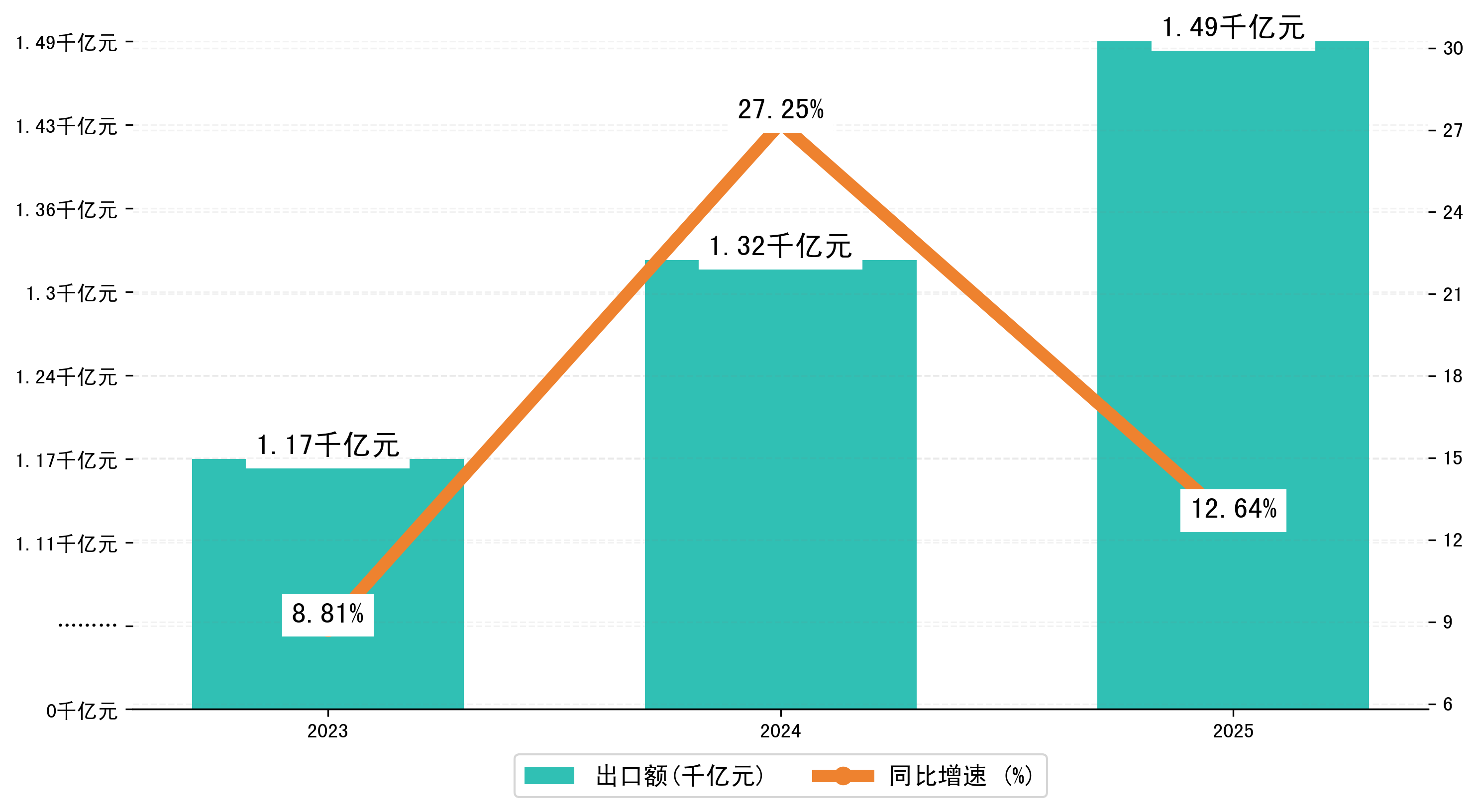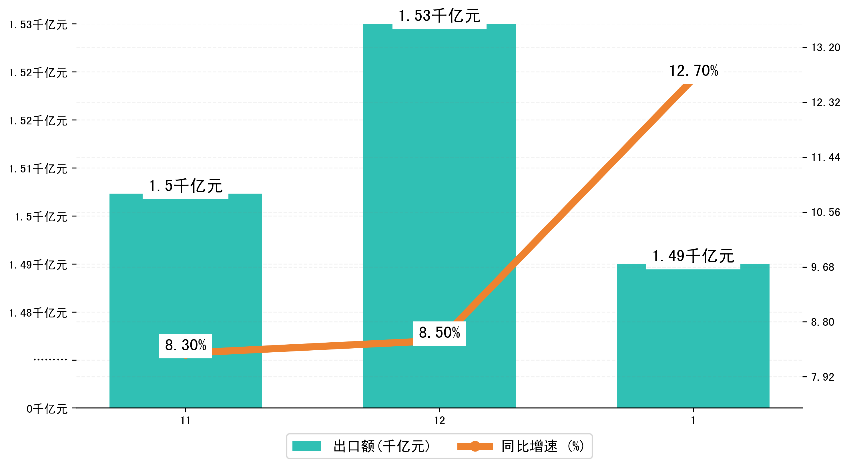 以人民币计,2025年1-1月苏州市出口额为1491,8613.4045万元,相比上年同期增加了167,3803.1055万元,同比增加了12.70%。