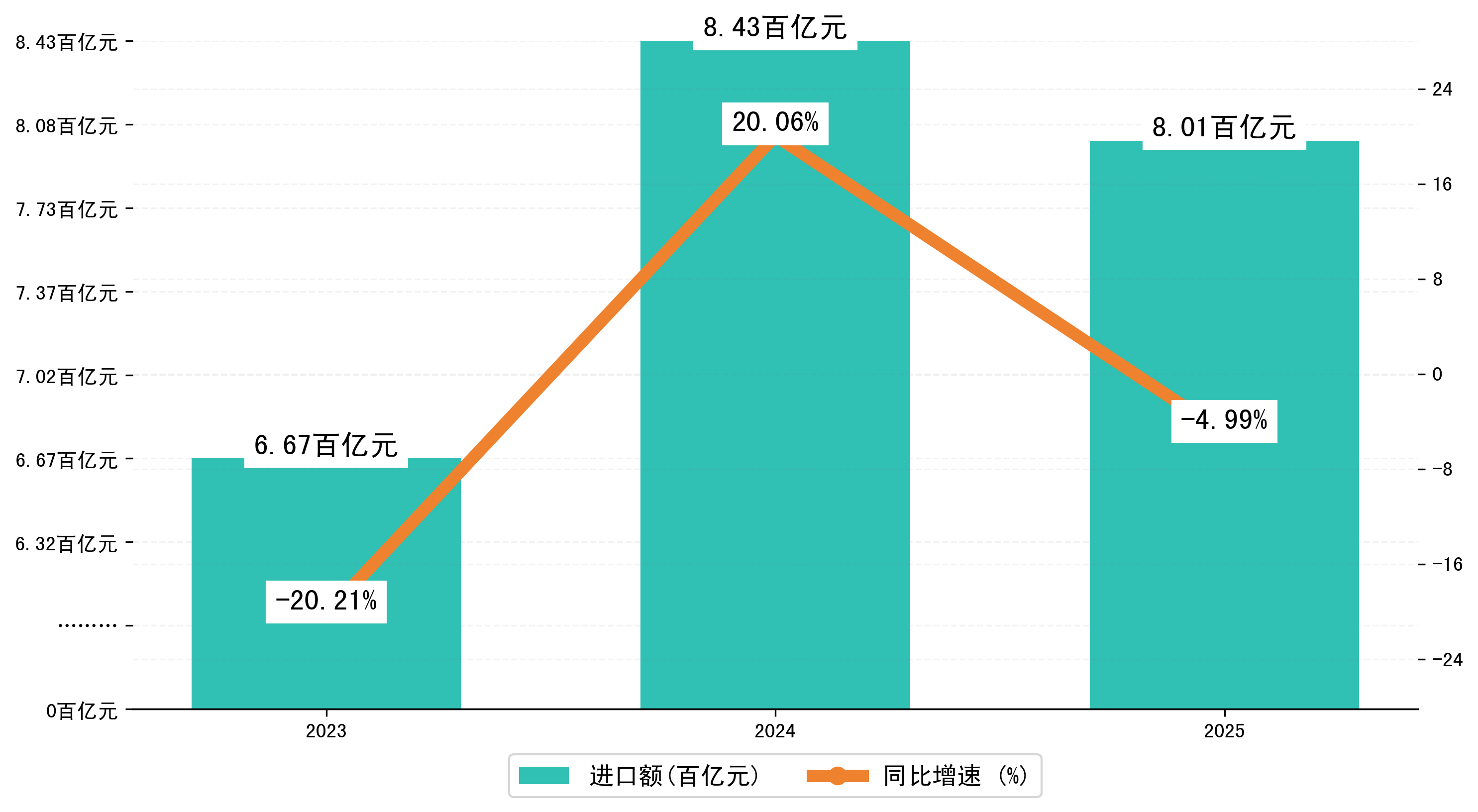 以人民币计,2025年1月苏州市进口额为800,9241.8005万元,相比上月减少了29,1110.9825万元;相比上年同期减少了42,0790.5906万元,同比减少了-5.00%。