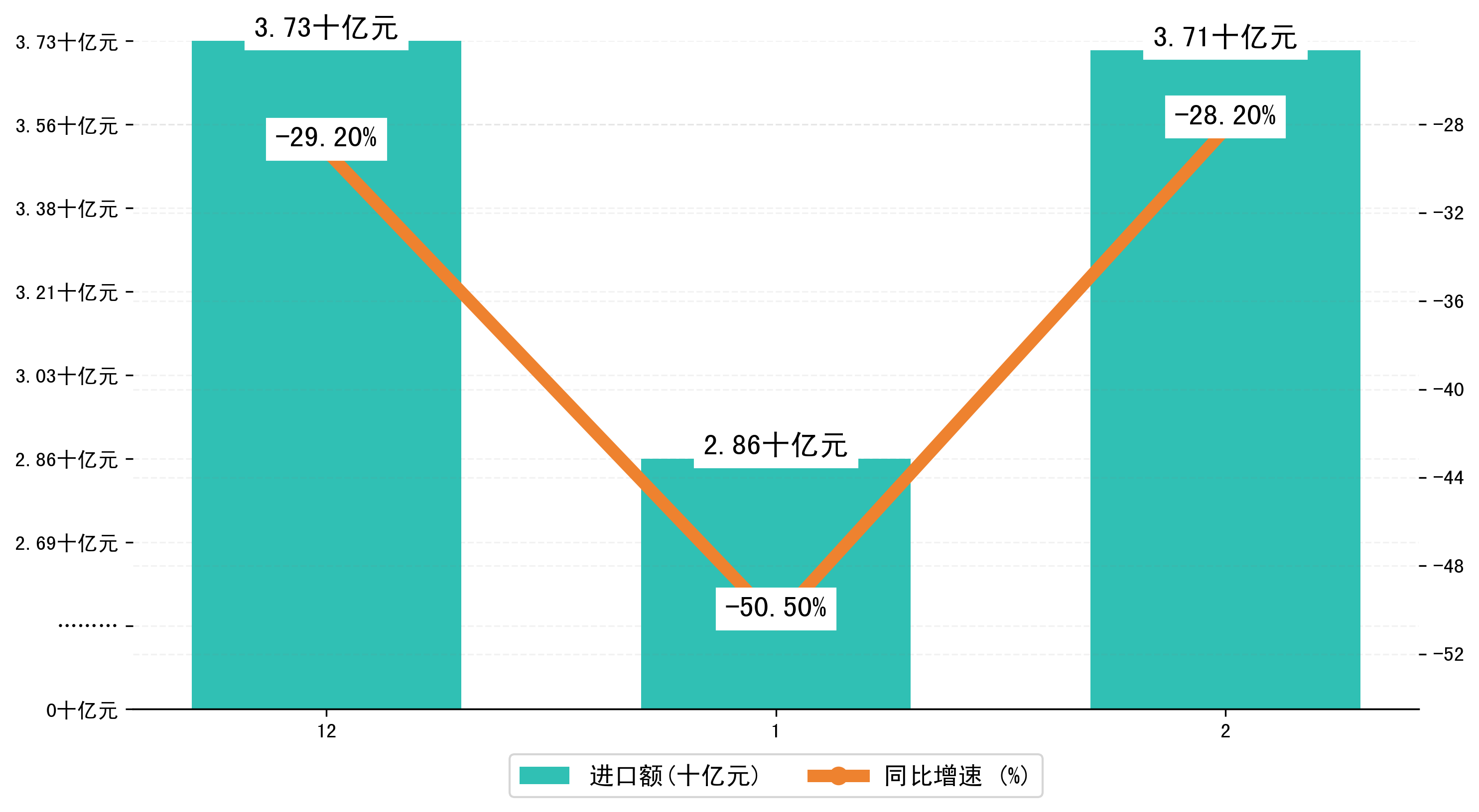以人民币计,2023年1-2月太原市进口额为65,7108.7154万元,相比上年同期减少了23,3591.9567万元,同比减少了-28.20%。