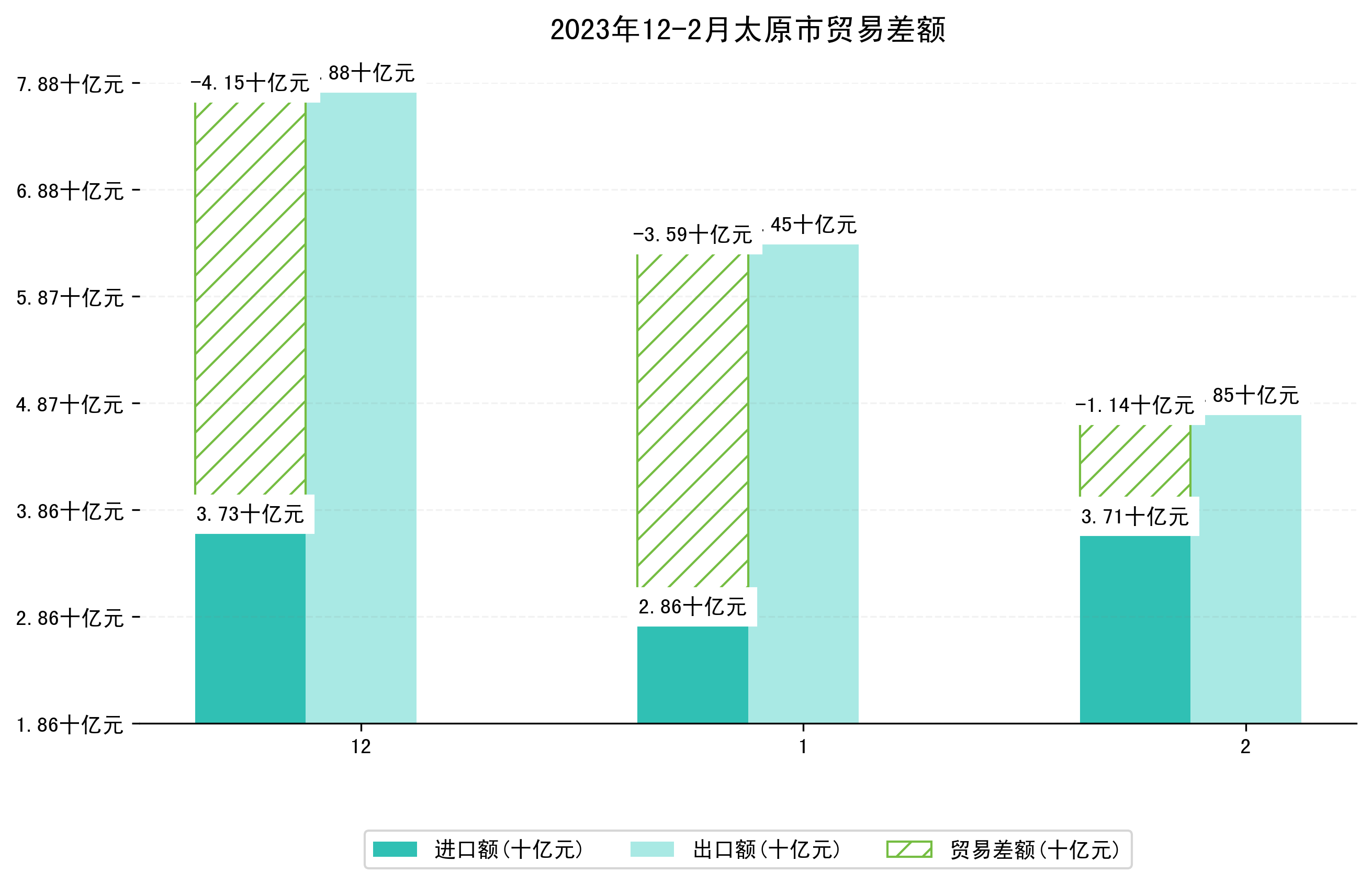 以人民币计,2023年1-2月太原市贸易差额为47,3082,6310万元(贸易顺差),相比上年同期减少了4,3769,1406万元,同比减少-8.47%。