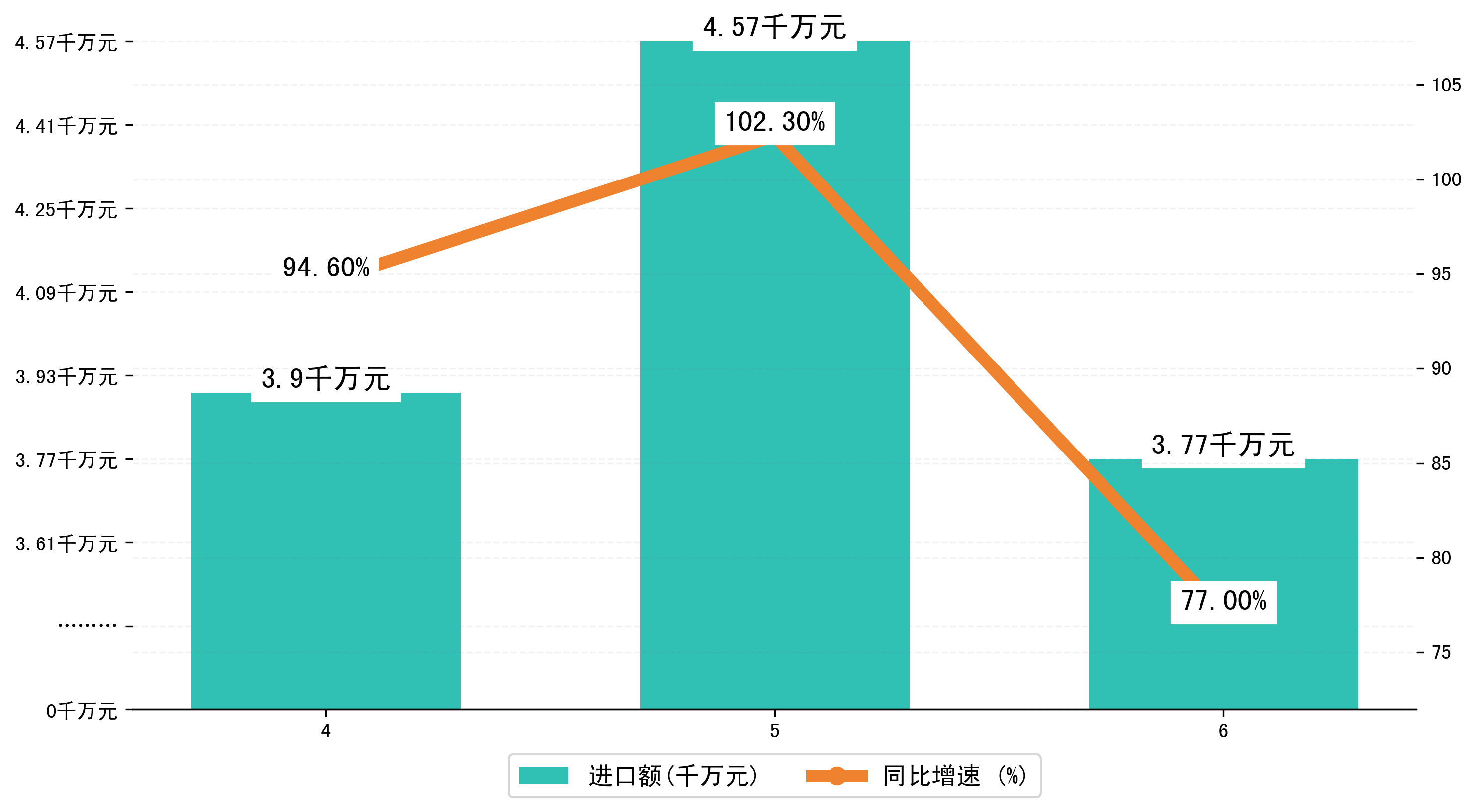 以人民币计,2025年6月大同市进口额为3772.6199万元,相比上月减少了795.0079万元;相比上年同期减少了146.6994万元,同比增加了77.00%。