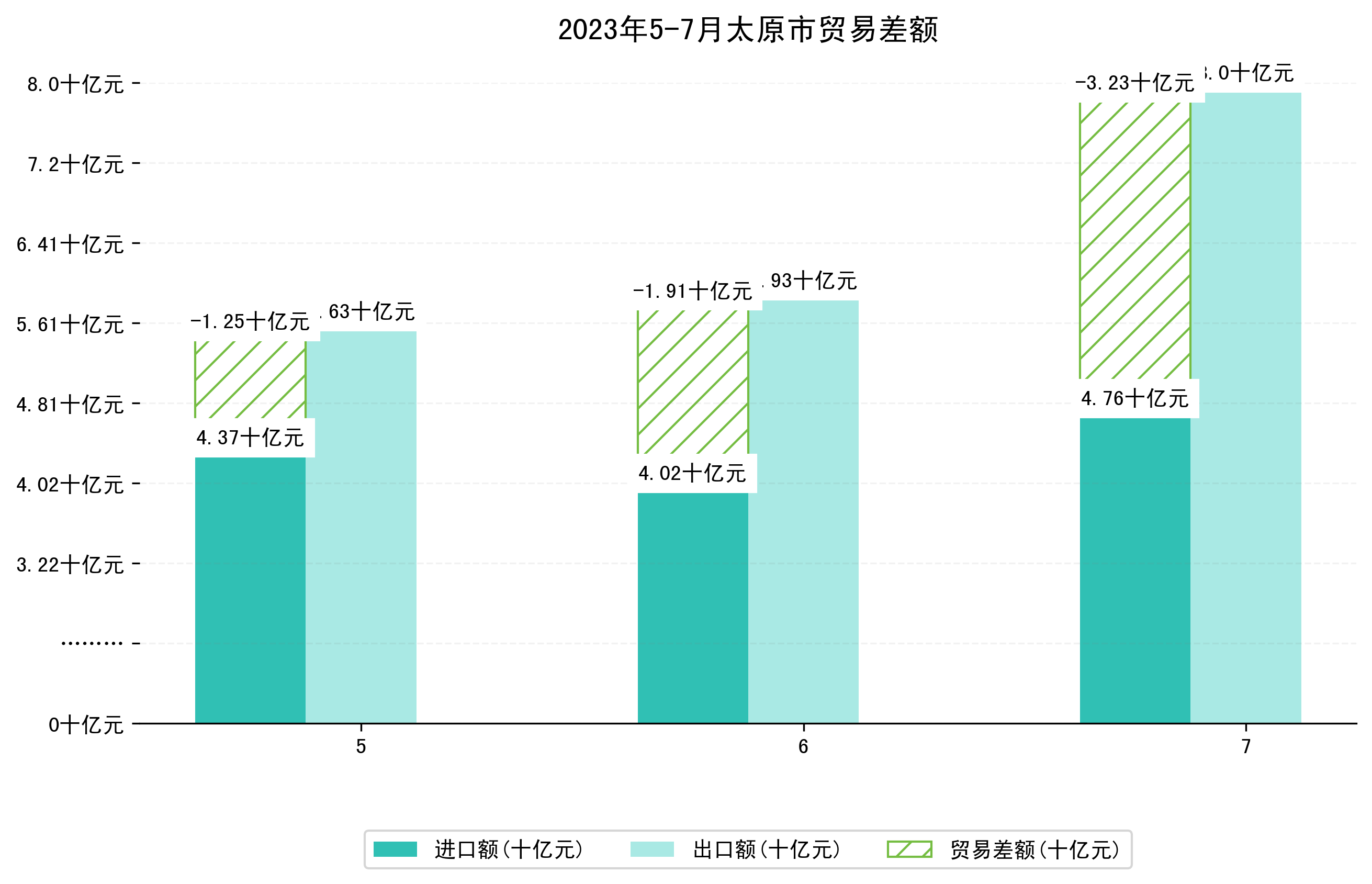 以人民币计,2023年7月太原市贸易差额为32,3484,9360万元(贸易顺差),相比上月增加了13,2110,0075万元,即1,7445,8809万美元;相比上年同期减少了13,6018,8566万元,同比减少-29.6%。