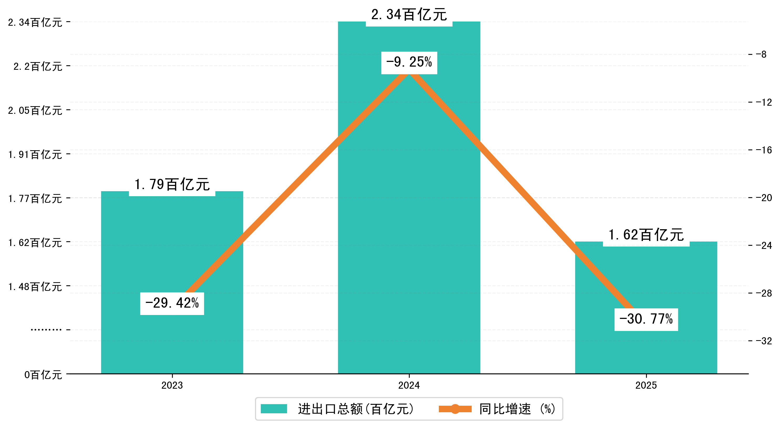 以人民币计,2025年1-2月太原市进出口总额为162,2063.1615万元,相比上年同期减少了72,0896.6554万元,同比减少了-30.70%。
