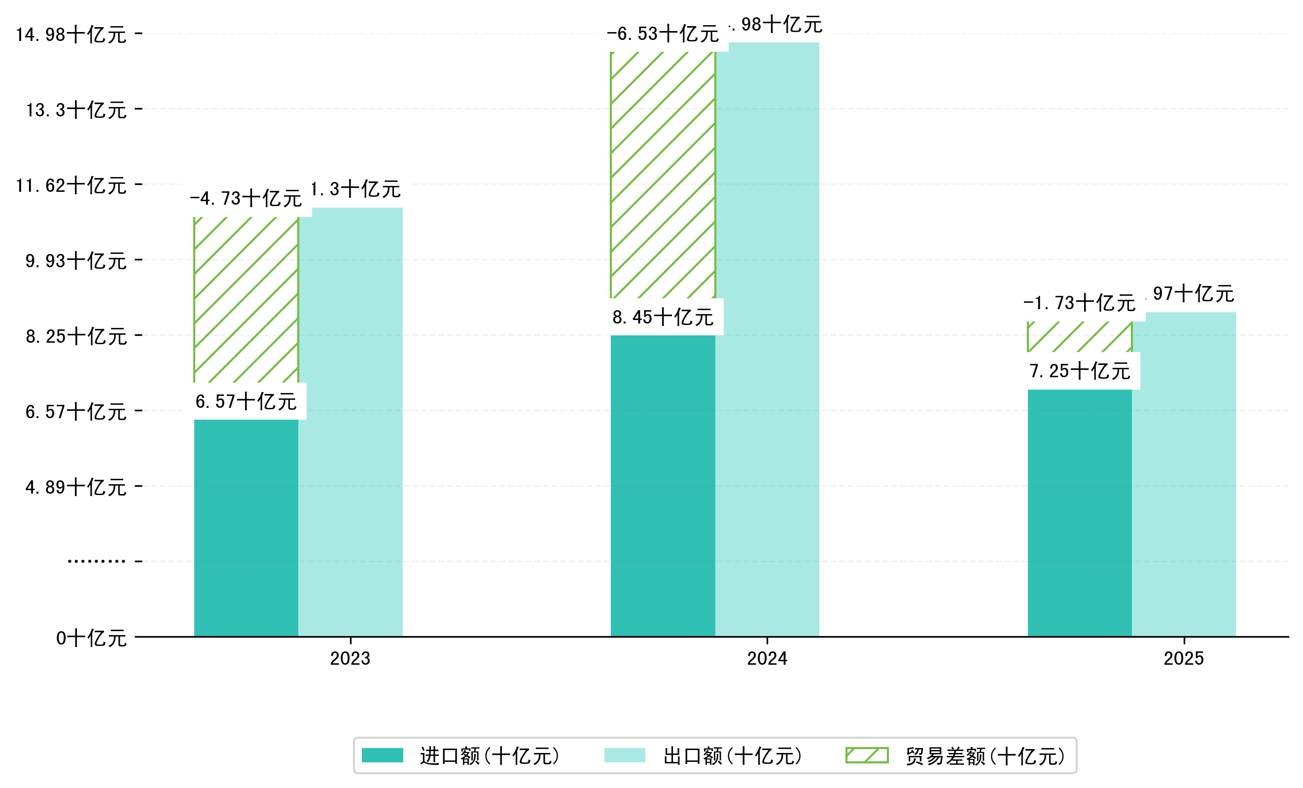 以人民币计,2025年2月太原市贸易差额为7,1273,7848万元(贸易顺差),相比上月减少了3,0249,8207万元,即4220,1438万美元;相比上年同期减少了30,0596,1330万元,同比减少-80.83%。