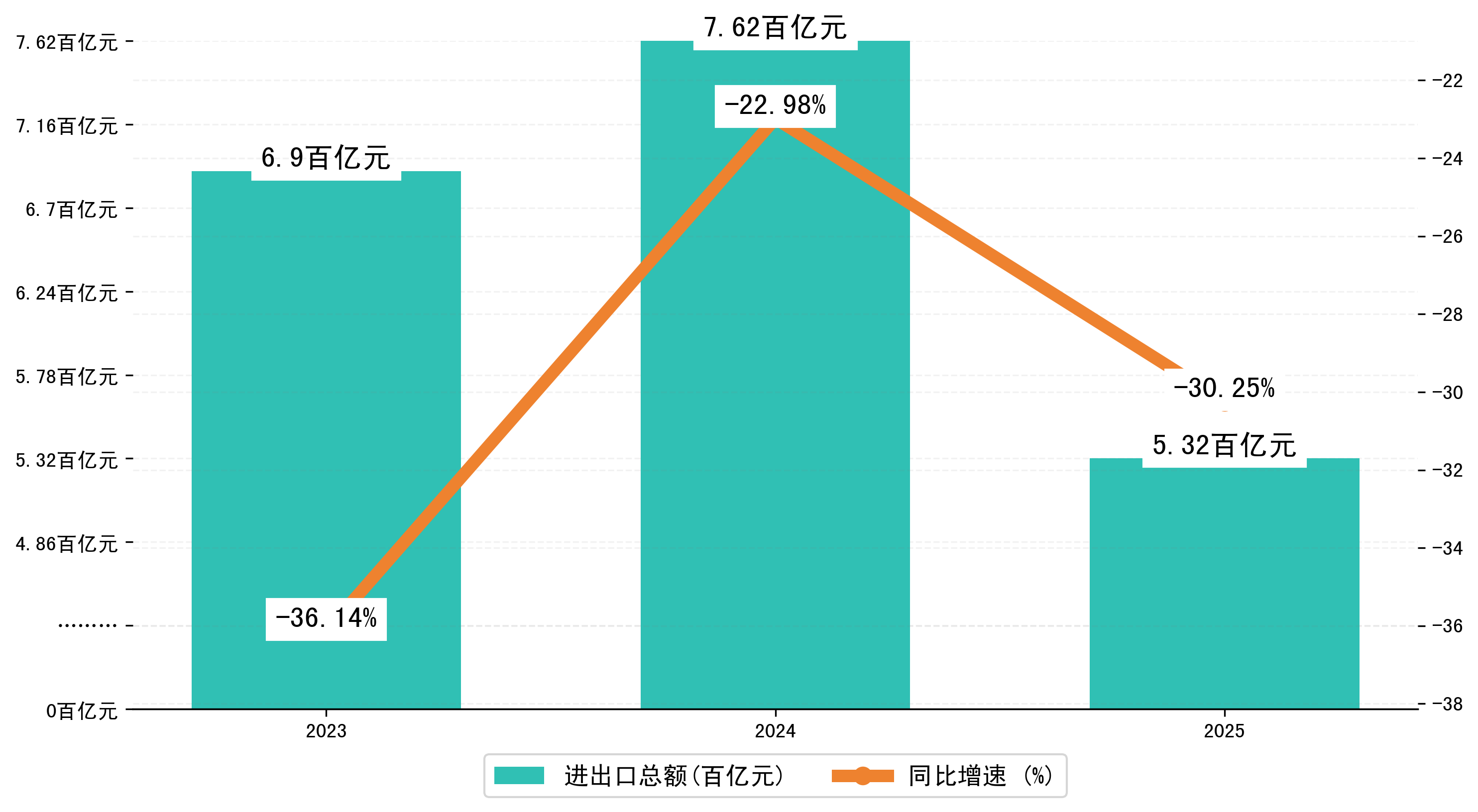 以人民币计,2025年1-7月太原市进出口总额为531,7998.8479万元,相比上年同期减少了230,5934.9886万元,同比减少了-30.10%。