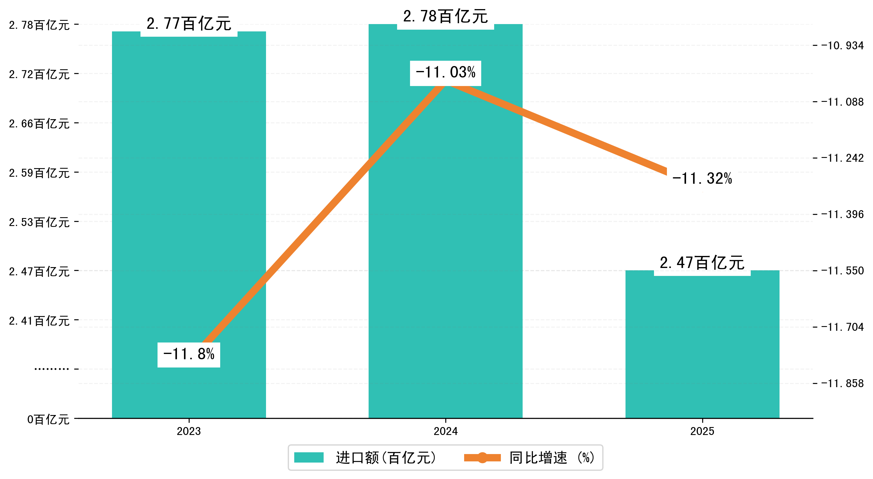 以人民币计,2025年1-7月太原市进口额为246,8485.8382万元,相比上年同期减少了31,5223.8321万元,同比减少了-10.90%。
