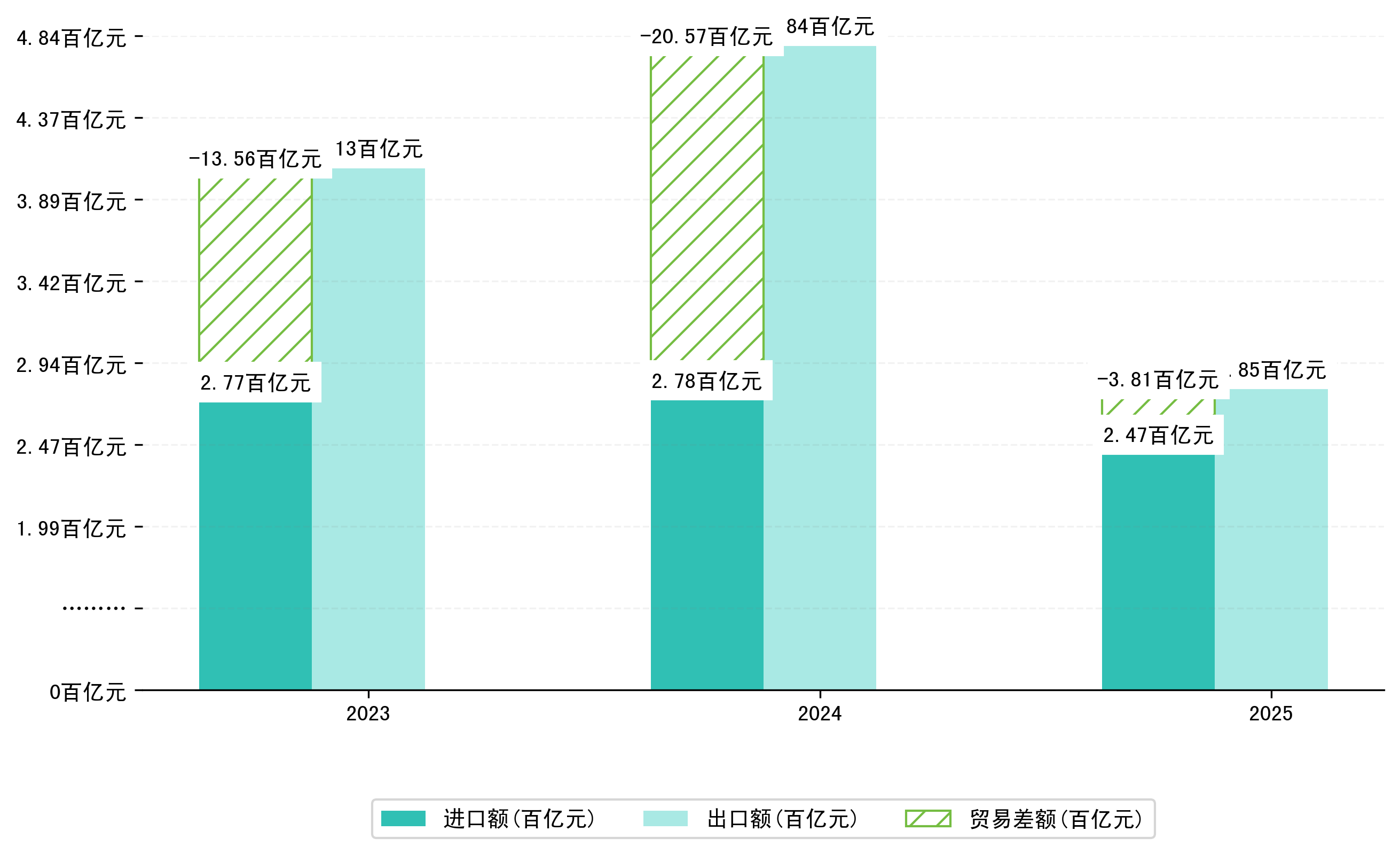 以人民币计,2025年1-7月太原市贸易差额为38,1027,1715万元(贸易顺差),相比上年同期减少了167,5487,3244万元,同比减少-81.47%。