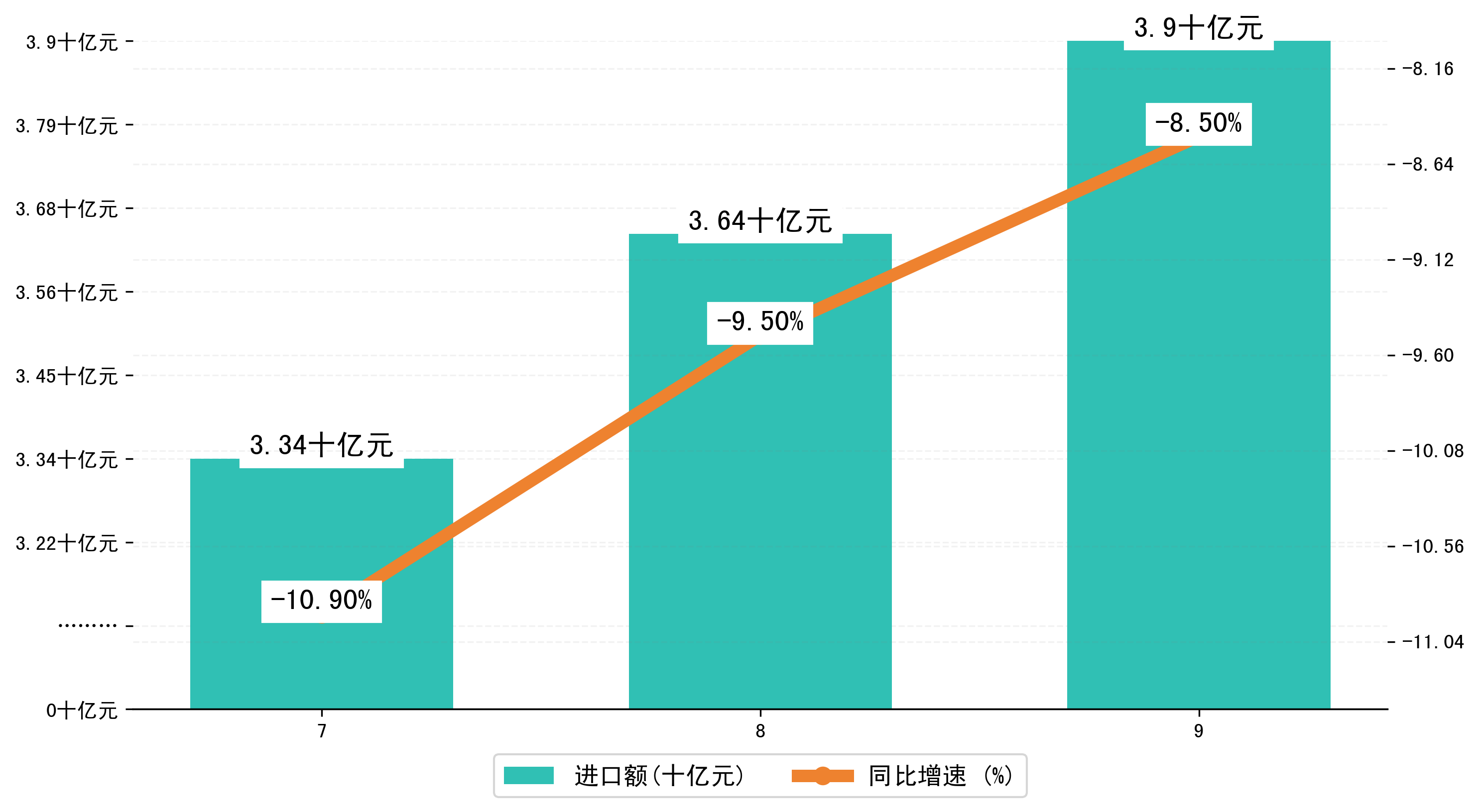 以美元计,2025年1-9月太原市进口额为44,7427.5285万美元,相比上年同期减少了4,7500.7651万美元,同比减少-9.40%。