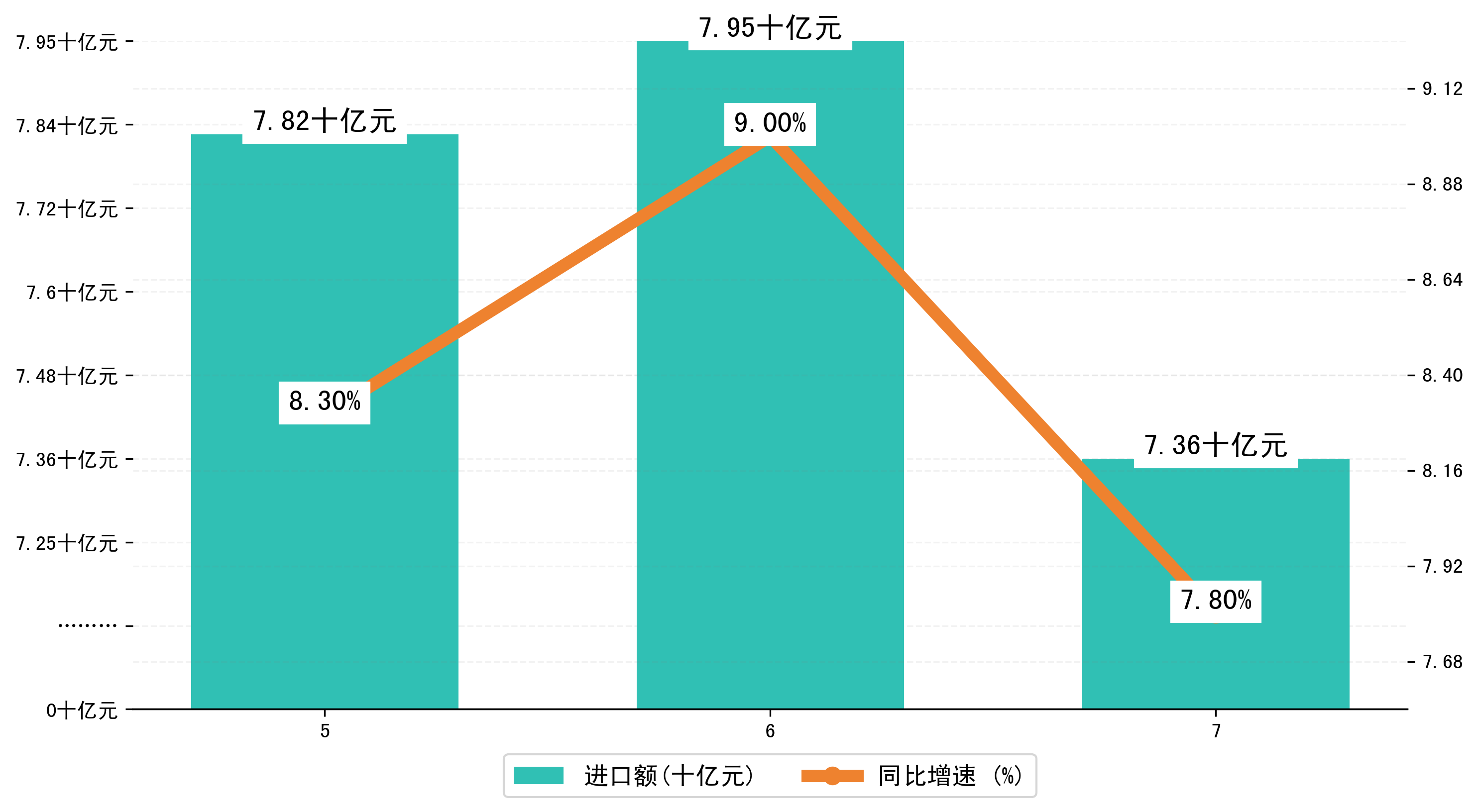 以人民币计,2024年7月唐山市进口额为73,6488.5691万元,相比上月减少了5,8811.0968万元;相比上年同期增加了9051.1443万元,同比增加了7.80%。
