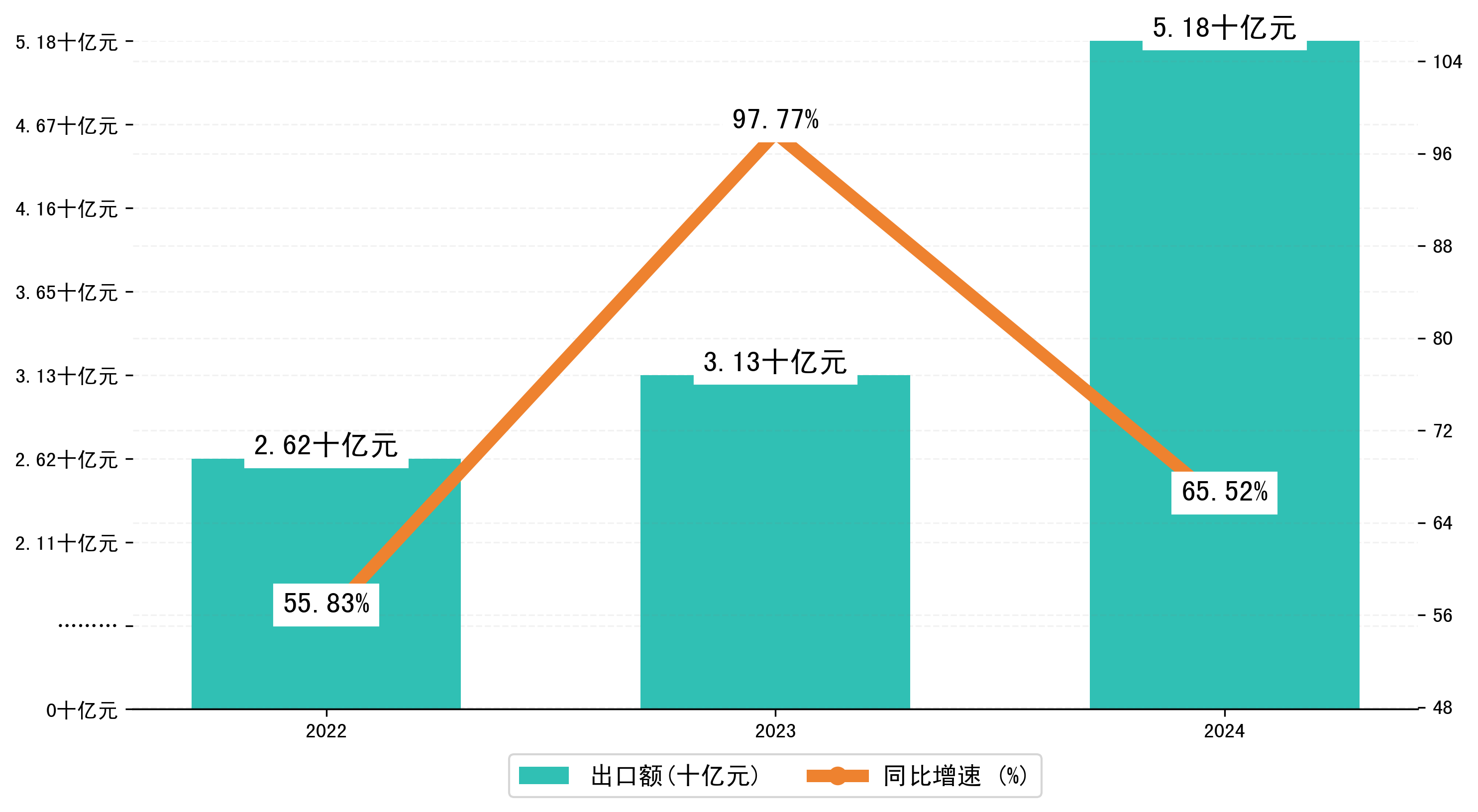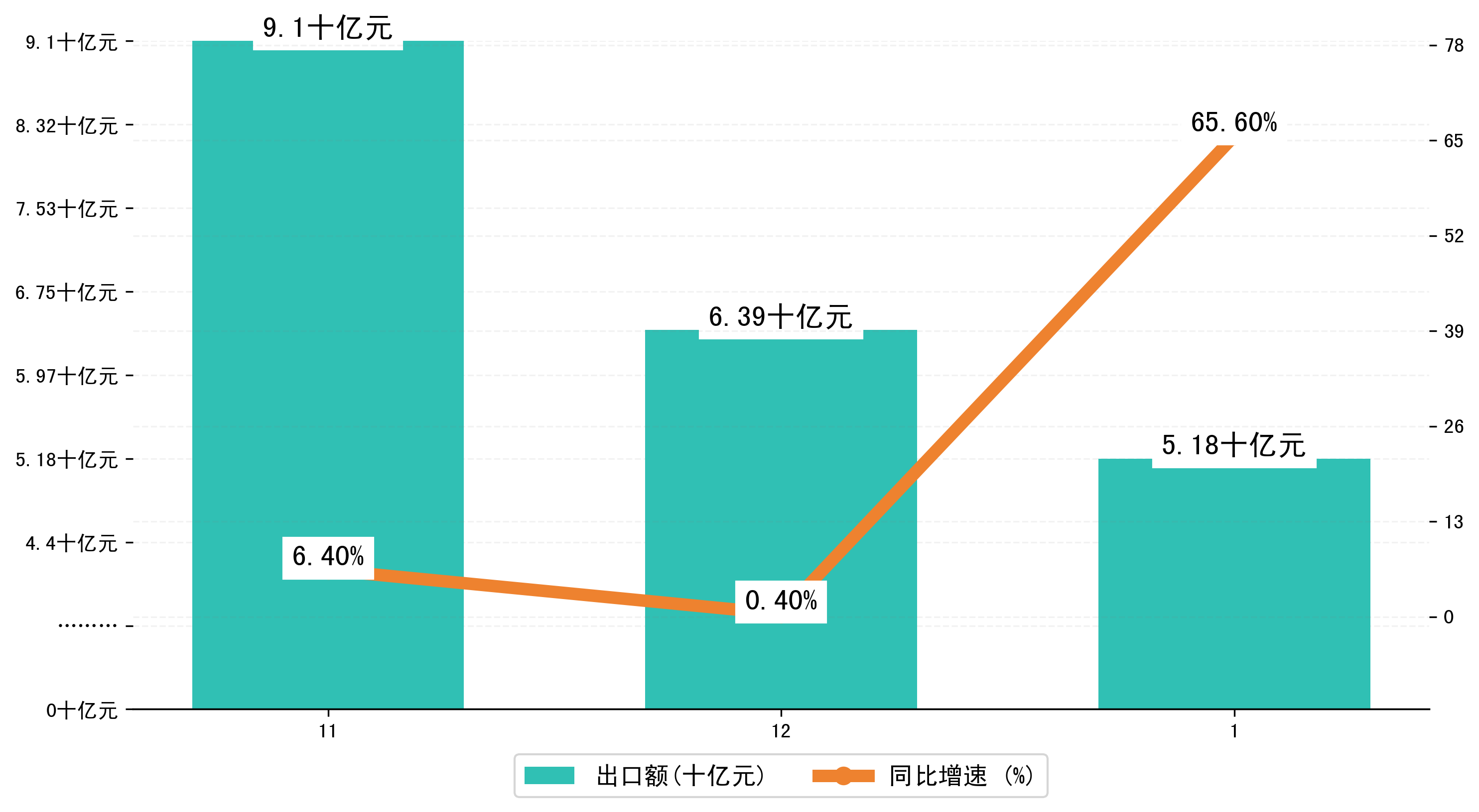 以人民币计,2024年1-1月唐山市出口额为51,8335.818万元,相比上年同期增加了20,5188.6832万元,同比增加了65.60%。